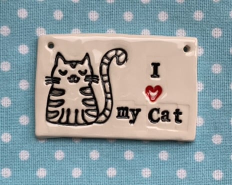 I cut out the tiles, then I stamp the motif/text, they are allowed to dry, I then colour with underglaze and fire them in my kiln. Then I clean them up, glaze them and fire again in my electric kiln.