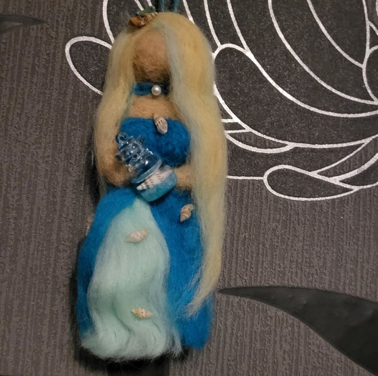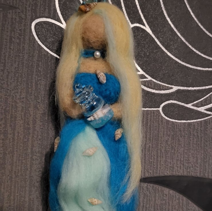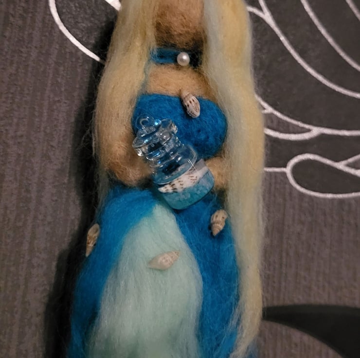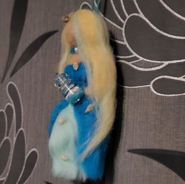 She has long blonde, blue highlighted hair with two tiny shells and a starfish decorating her hair and she is holding a glass jar that has a tiny shell 'water' and blue, luminous stones inside.