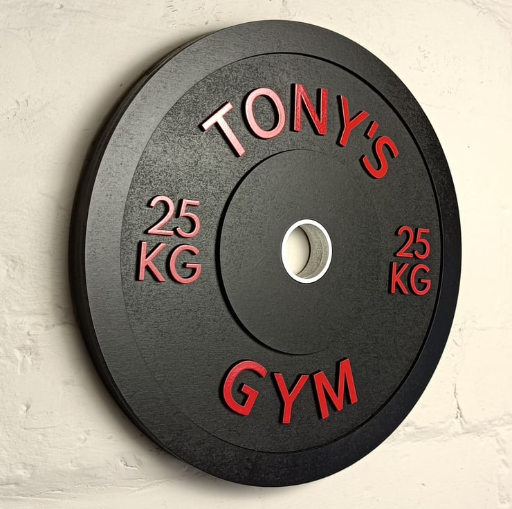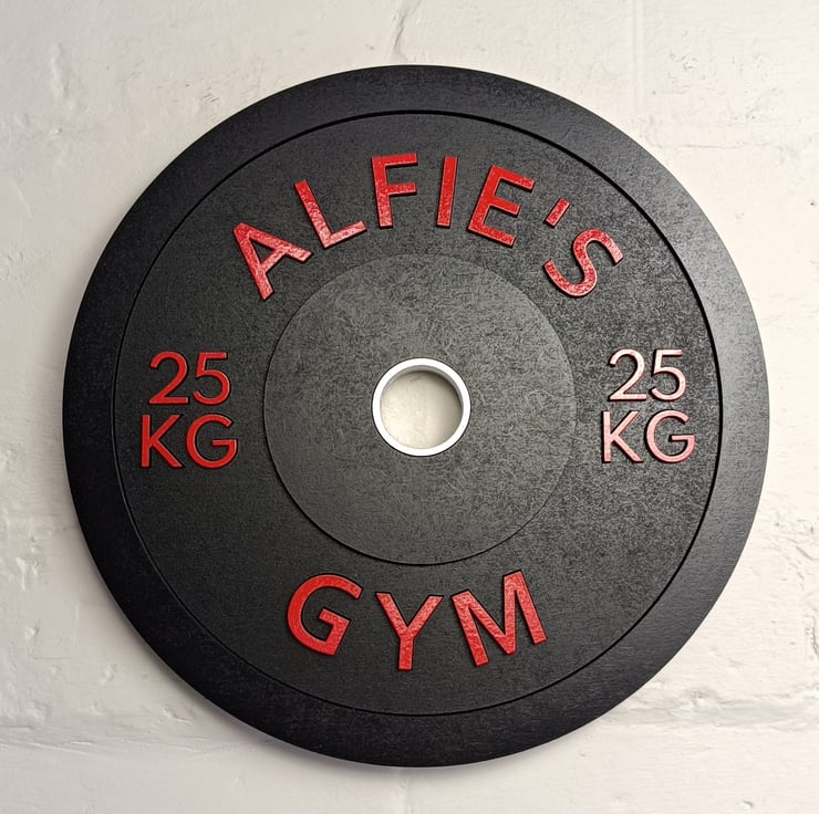 The whole sign is painted in a satin black background with a chrome effect centre to mimic real bumper weights. You can choose to have the raised letters in one of 5 different colours