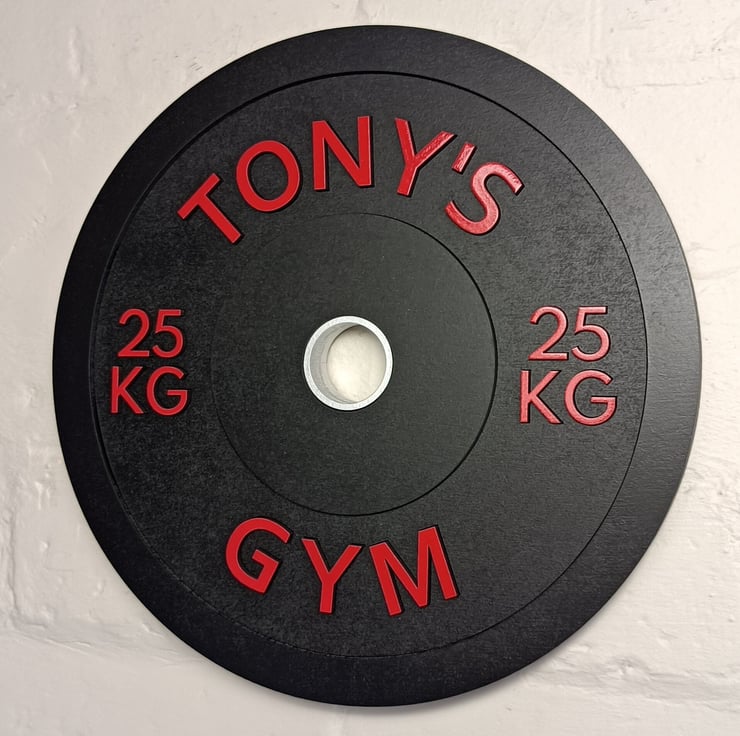 This stunning high quality 290mm diameter and 18mm thick sign has been designed with different thickness of MDF creating a heavy scale version of a barbell weight including the centre hole, the raised edge, and the weights in Lbs & kgs.