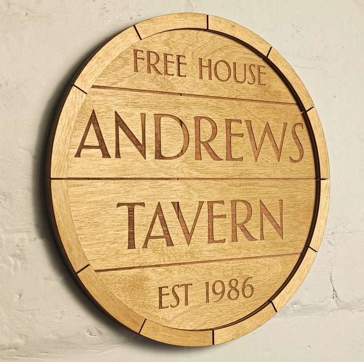 The text is deeply laser engraved into the plywood and you can choose your own personalisation, it doesn't have to be tavern it could be Penny's pub, Jack's room or whatever else you might fancy and whatever date you require
