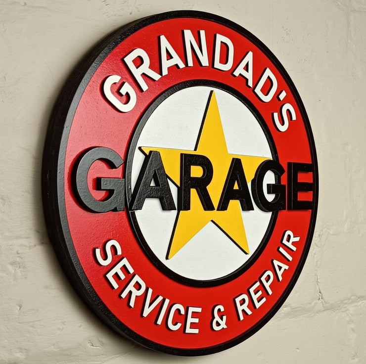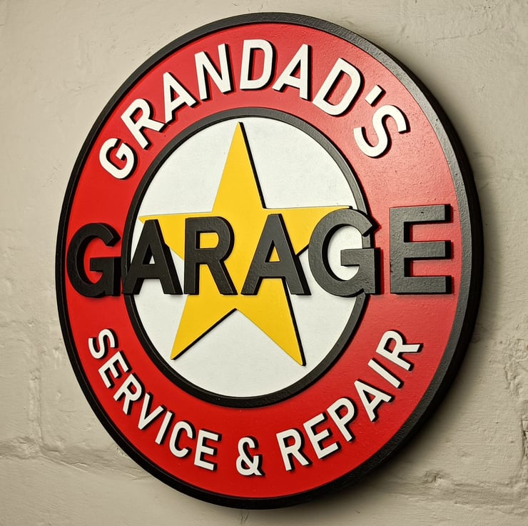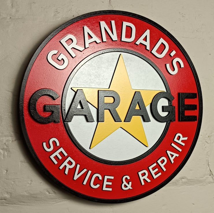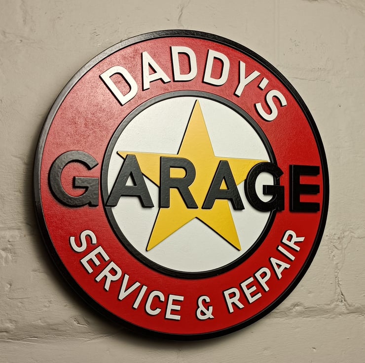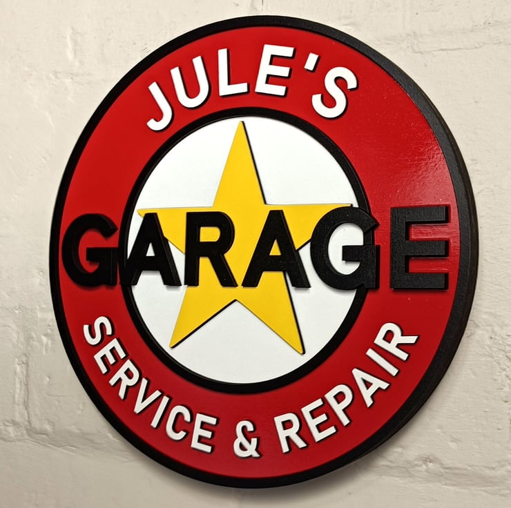 This stunning sign has been designed with different thickness of MDF in the style of a retro advertising Petroliana logo with a yellow star motif in the centre and raised text to make it really stand out against the colourful background. You can choose the Garage name across the top line whether it is for you or if it is a gift for someone else.