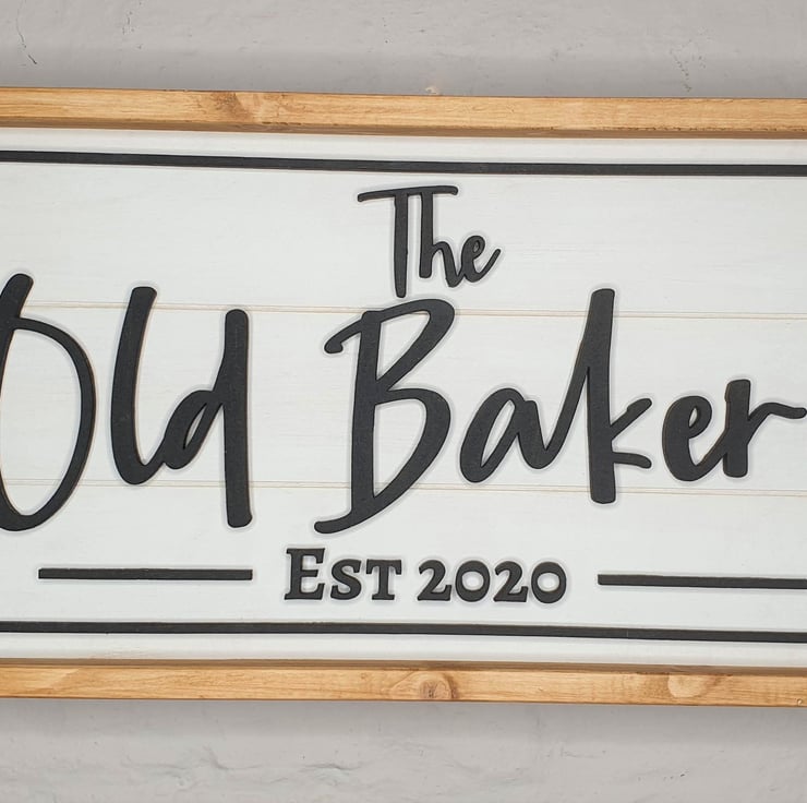 The background of the sign is made from birch plywood which has lines engraved in it to produce the shabby chic look of whitewashed boards. The letters are cut from quality MDF and are painted with blackboard paint to contrast with the background and to give a raised 3D finish. The frame is made from solid pine which is stained in a country oak stain to complete the look.