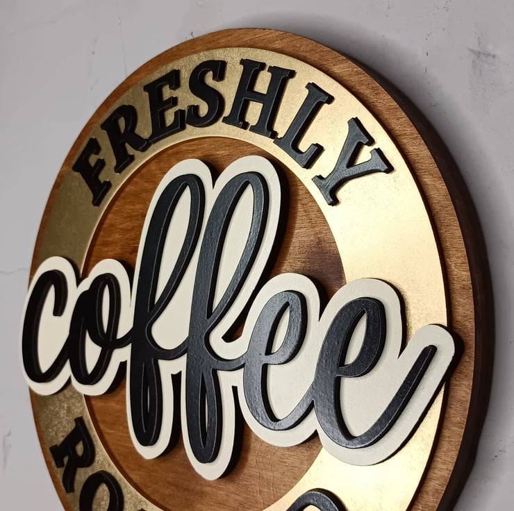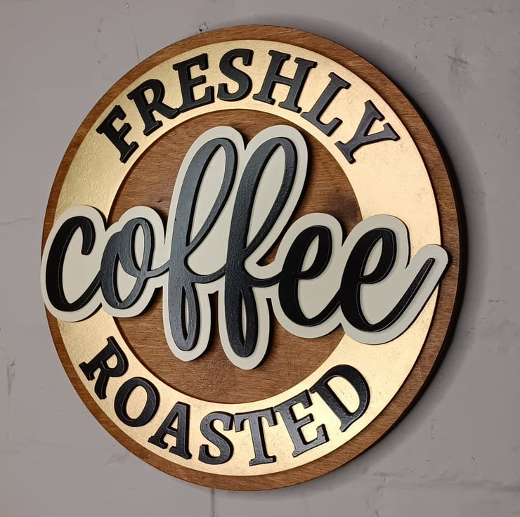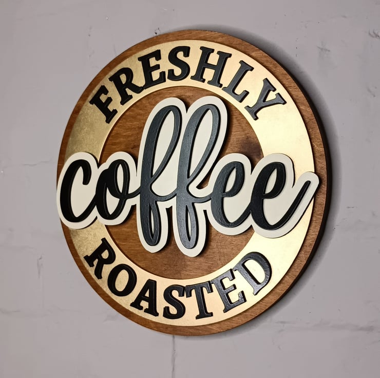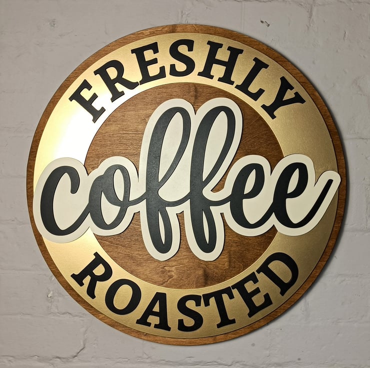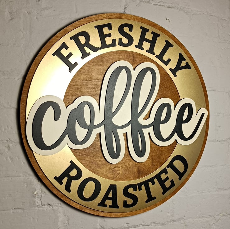 The Freshly Roasted Coffee sign features a 12mm solid birch plywood background, the motif is designed so that each layer is a different height to give a 3D effect that really makes the words stand out.