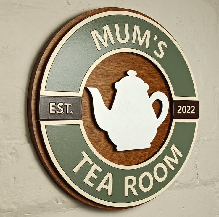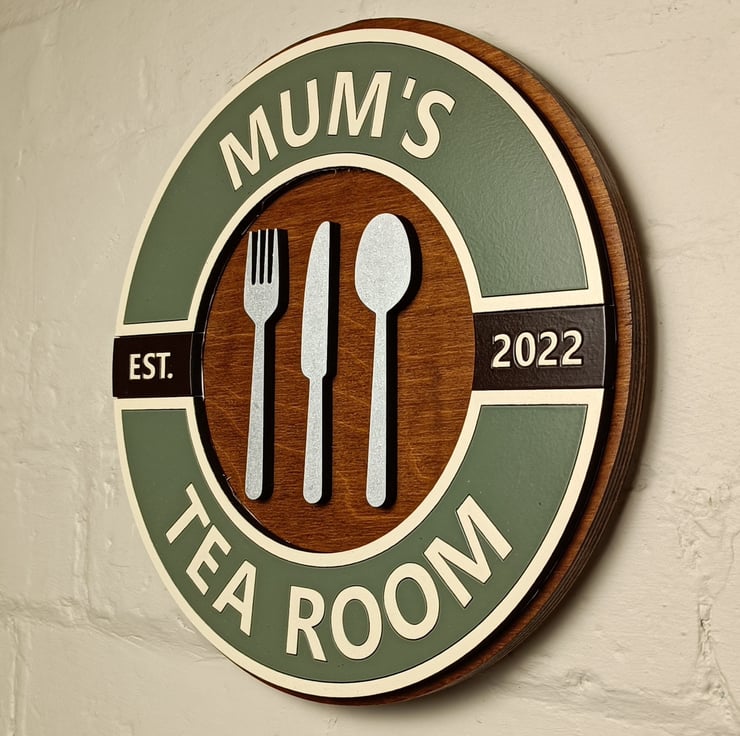 Each sign is made from a solid 12mm Birch plywood background which is varnished with a satin Walnut finish to really set off the retro look and the letters are laser cut from painted 6mm MDF