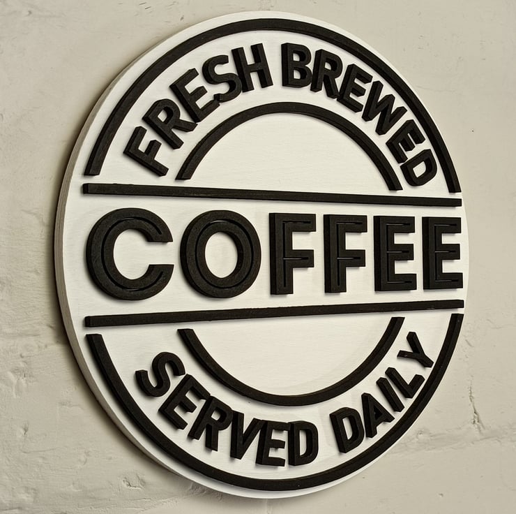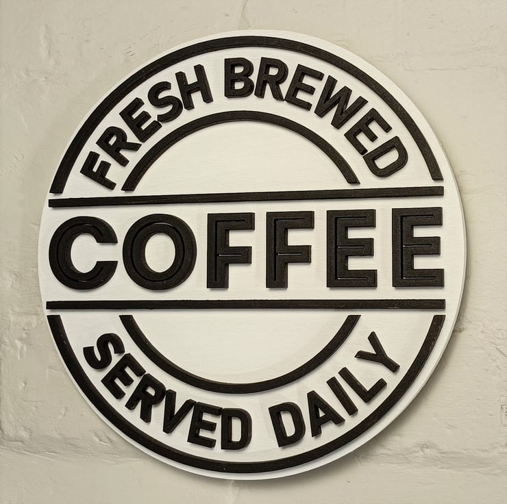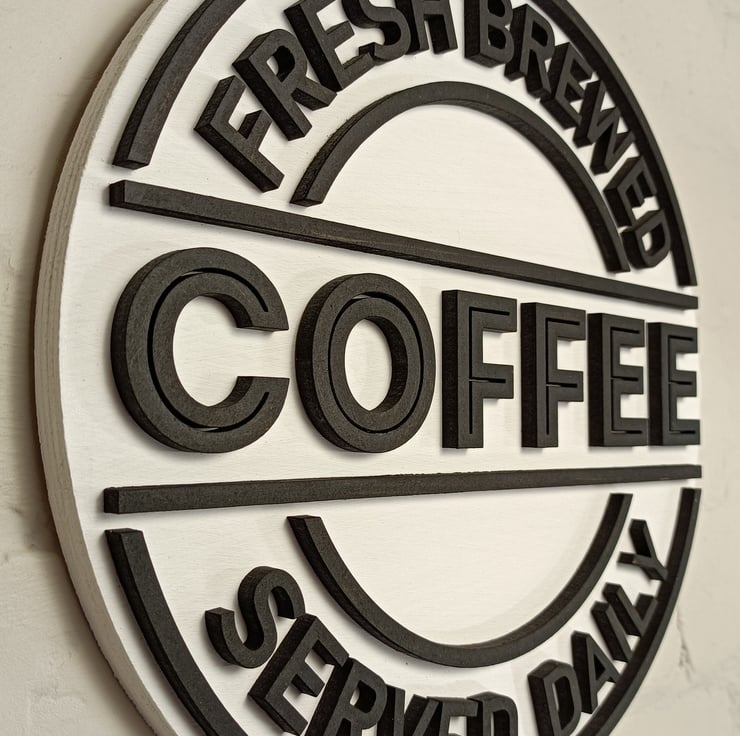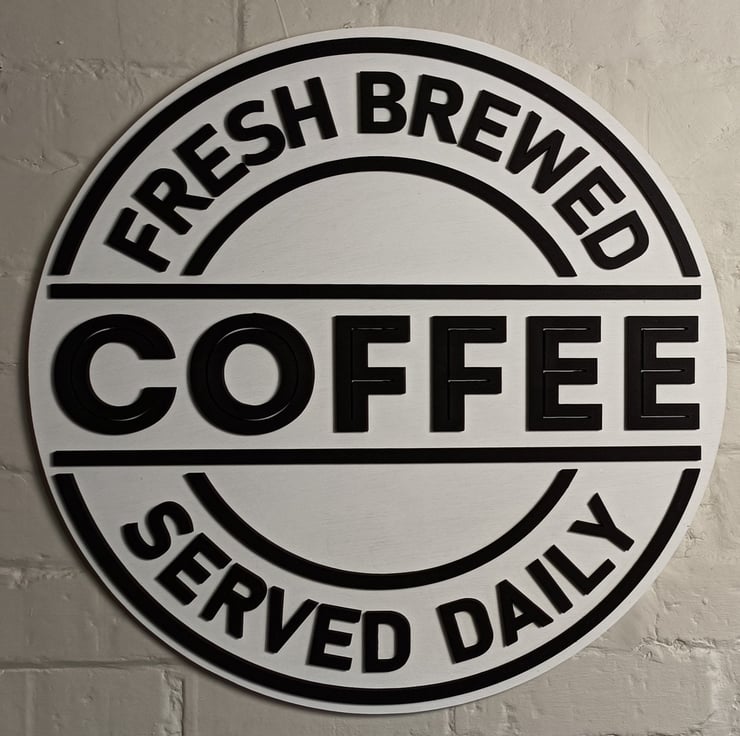 This sign measures 29 cm and features a 12mm solid birch plywood background which is painted in a matt white paint. The 3D letters are laser cut from MDF with matt black Fresh brewed Coffee served daily lettering giving a striking contrast to the white base