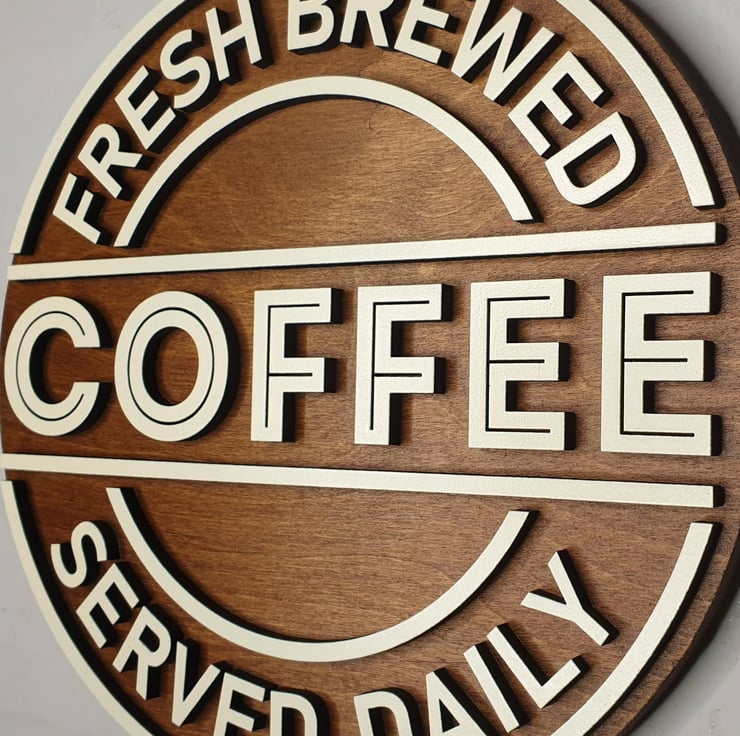 The Coffee sign features a 12mm solid birch plywood background which is varnished in a Walnut varnish echoing the dark brown colour of Coffee Beans. The 3D letters are laser cut from MDF with satin cream Fresh brewed Coffee served daily lettering giving a striking contrast to the dark base