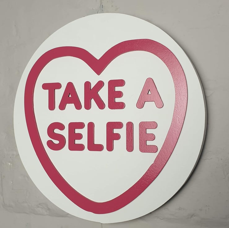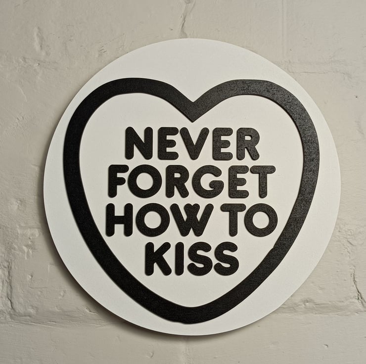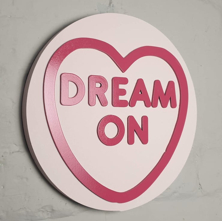 The sign measures 29 x 29 the base is cut from 18mm MDF and painted in white, pink, purple or yellow to mimic the chunkiness of these retro sweets with the words and heart motif painted in a pink gloss