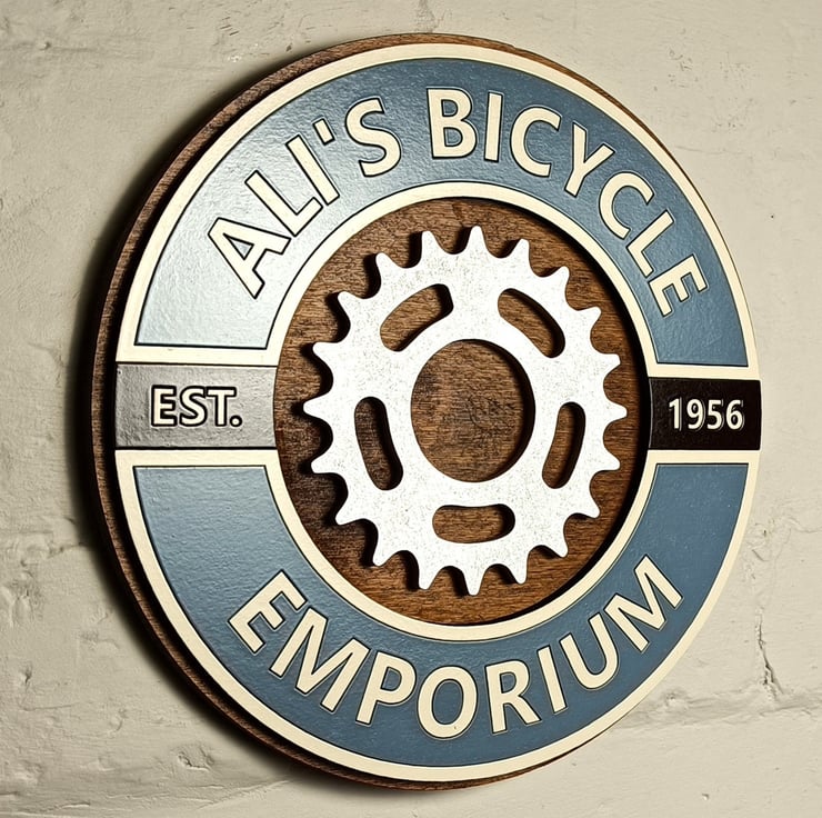 This unique sign has a vintage inspired colour scheme and uses either slate blue or sage green as the main colour with cream and a gloss brown for contrast with a raised chrome painted stylised crank design as the centre motif. The background is made from solid birch plywood painted in a Walnut varnish to really finish off the retro look,