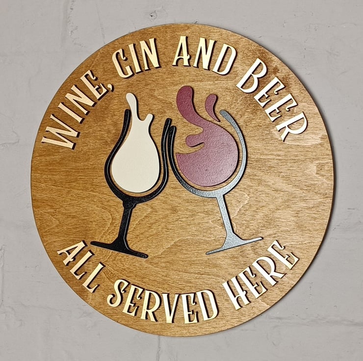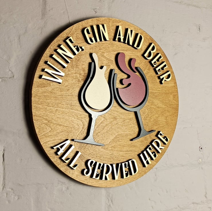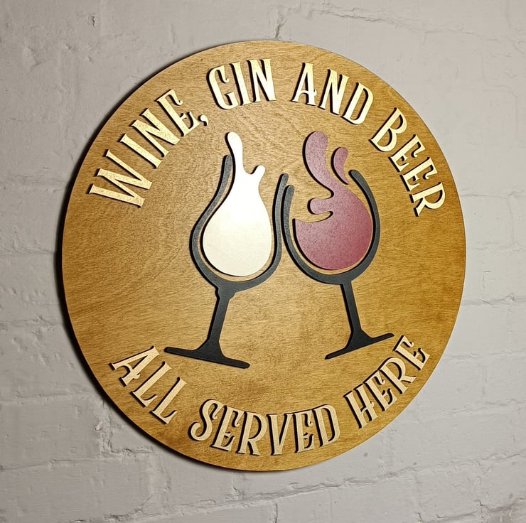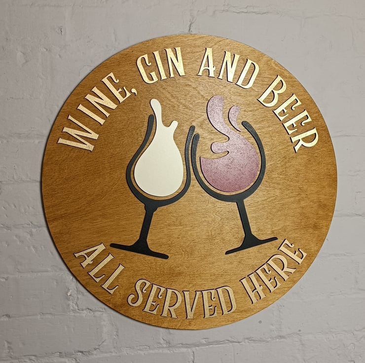 This stunning sign is made on a solid 12mm birch ply base that is varnished with a satin oak finish and has two wine glasses clinking as the centrepiece of the design with the text 'Wine, Gin & Beer all served here' in a gold painted finish. All of the decoration is laser cut from 6mm MDF and is applied to the base to give the 3D effect
