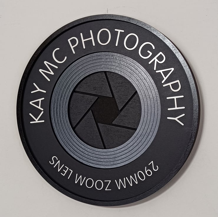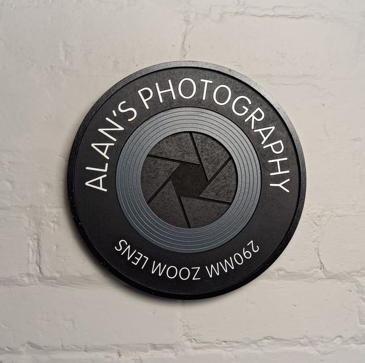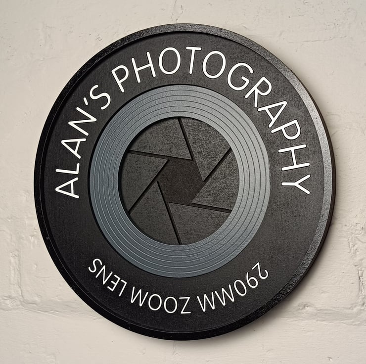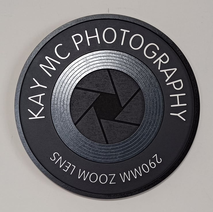 The sign is painted with gloss, matt and satin sheen blacks as well as a sating grey inner ring to subtlety depict the parts of a lens including the shutters in the centre and the raised ring around the edge. The text is in a typical lens font and is painted in satin white with the bottom text being standard with your choice of text on top, you can choose Debbie's dark room, Paul's photography, or colin's camera or anything else that takes your fancy.
