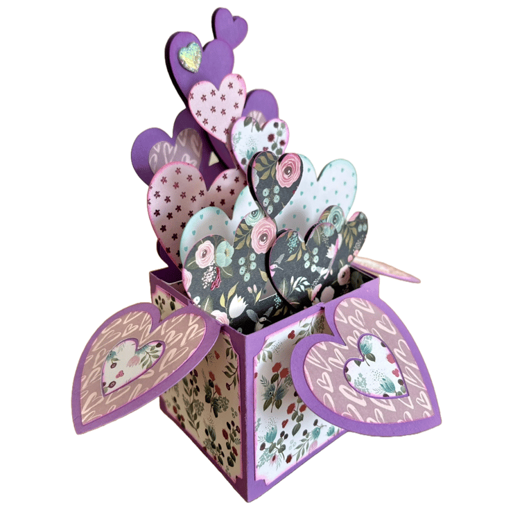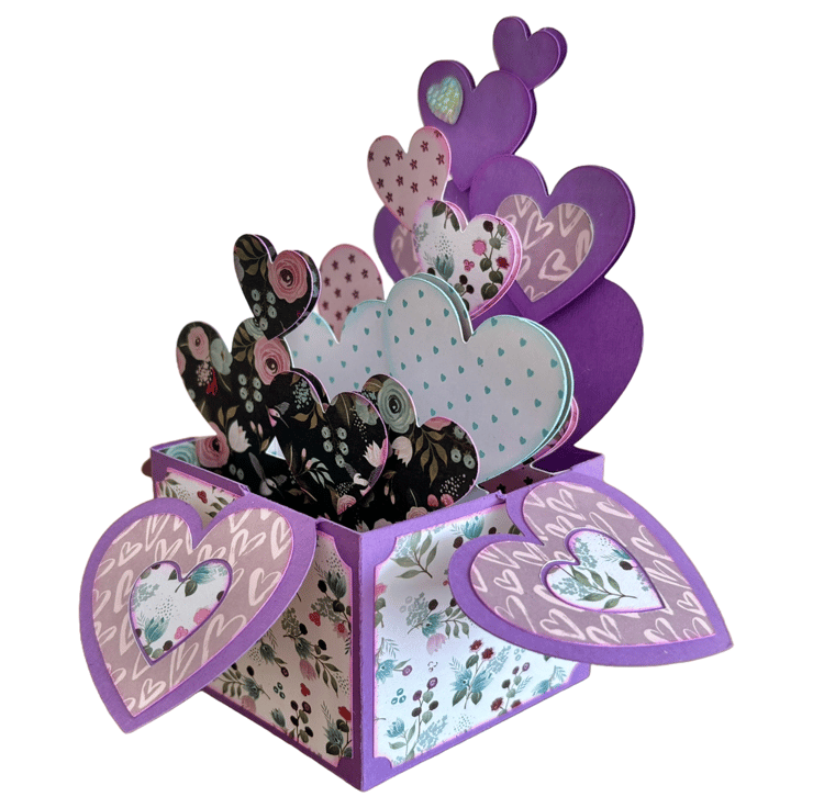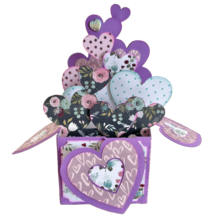 The purple pop-up box features an array of unique heart patterns in shades of purple and teal. These colors dance together, are charming and elegant, creating a scene that is both enchanting and memorable. This card is perfect for Valentine's Day, anniversaries, or simply to say thank you, brightening someone's day with its magical charm.