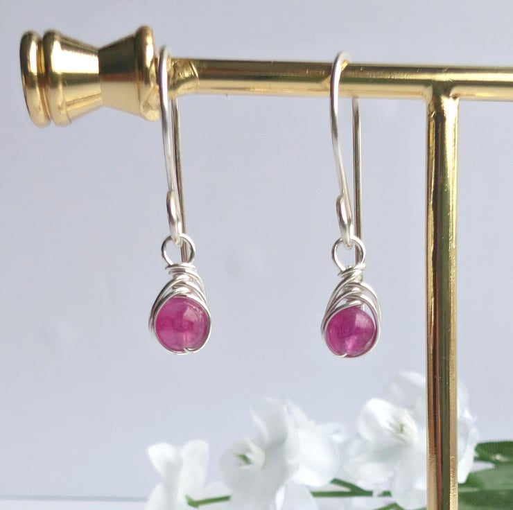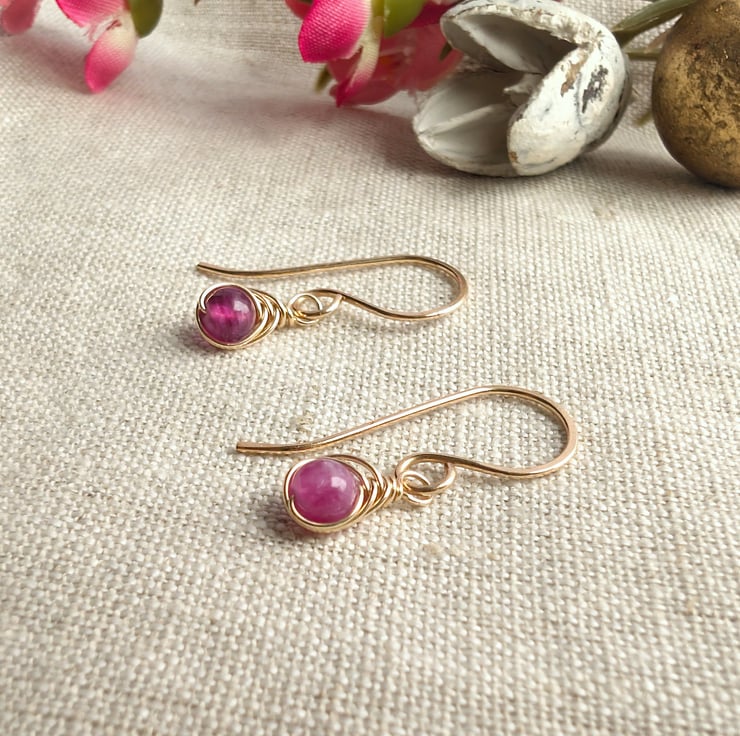 Dainty sterling silver dangle earrings featuring pink tourmaline beads. Small pink tourmaline beads wire wrapped in a herringbone weave to form a frame around the gemstones. These earrings would make a lovely gift for yourself or a loved one.