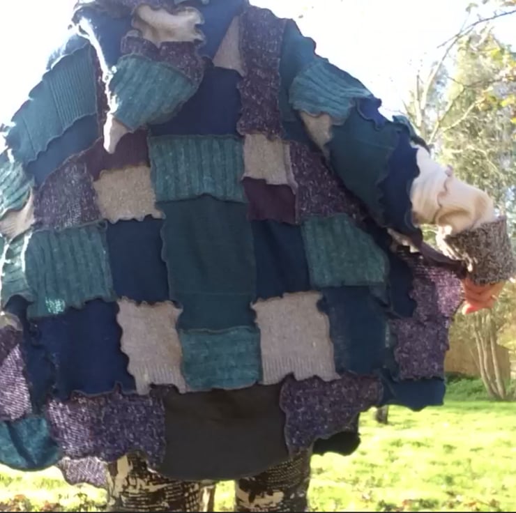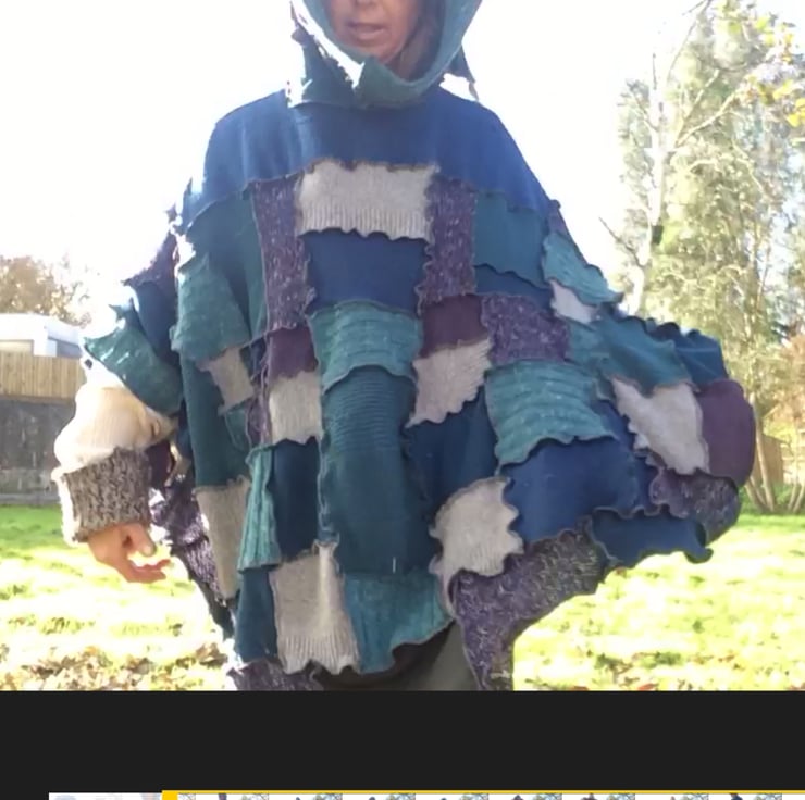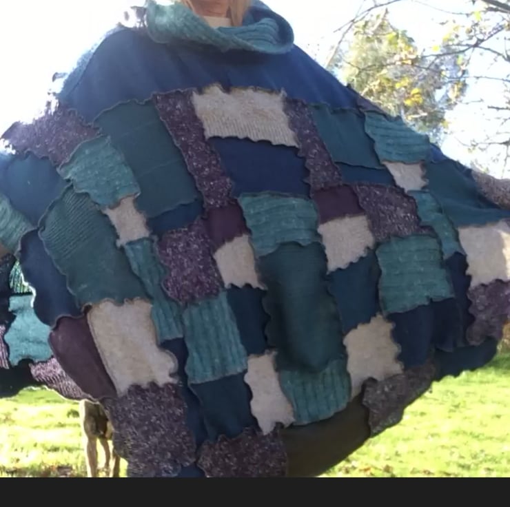 Wonderfully warm woollen poncho made from reconstructed jumpers in shades of green, blue and grey. Large freesize with a hood that can be rolled into turtleneck. Handmade by me, with love from my little attic… inspired by stormy seas