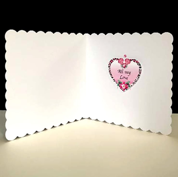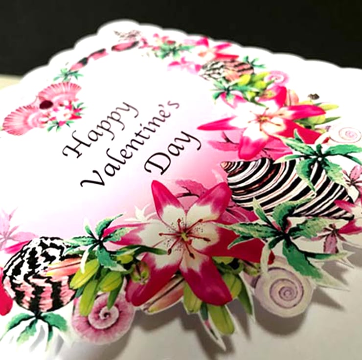 A change from the traditional red roses is this tropical contemporary Valentines Card. These fabulous lilies were photographed in my garden last summer, with a fashionable skin print heart and hand-painted shells it make a stunning design. This beautiful heart, saying 'Happy Valentine's Day'. It is hand-cut and mounted on a white scalloped edge card with pink and green glass gems to add a little sparkle for the special day. Inside is another smaller heart saying ‘With all my Love'