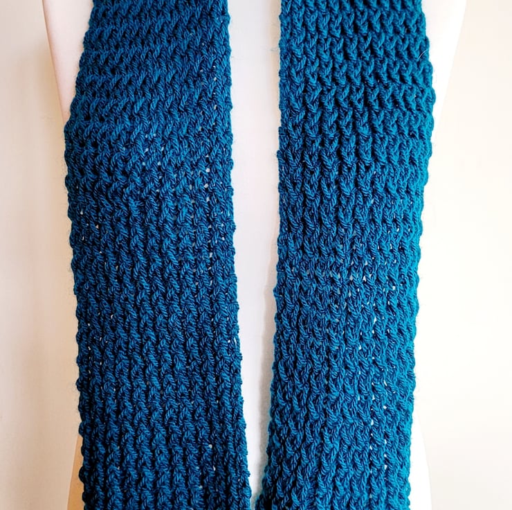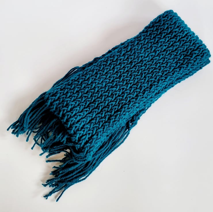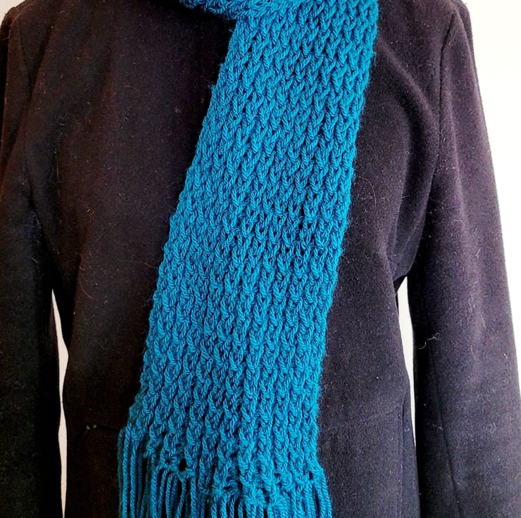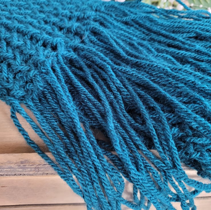 Wrap yourself in the warmth of our exquisite teal scarf! Hand knitted with love, this ladies scarf is perfect for the autumnal/Winter season, inviting you to embrace the cooler days ahead in style. With its rich teal hue, this hand knitted scarf adds a pop of colour to any outfit, making it an essential accessory for the fashion-forward.