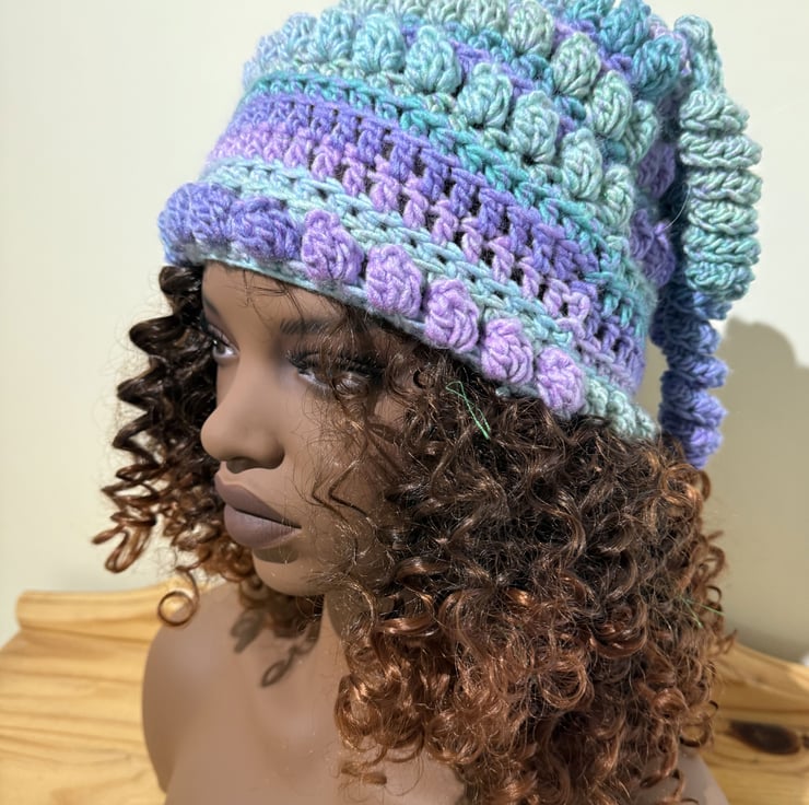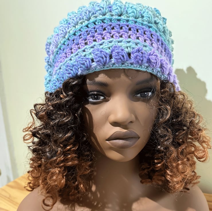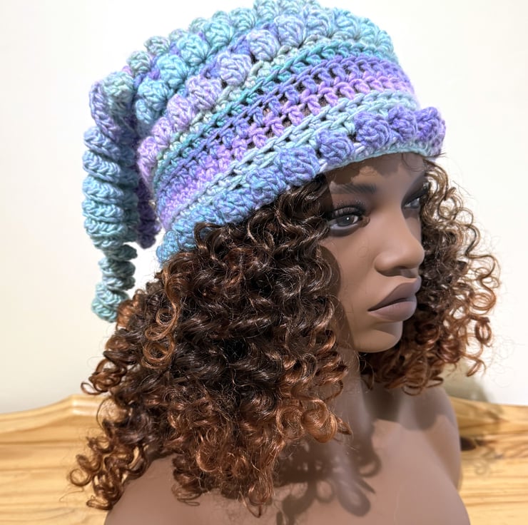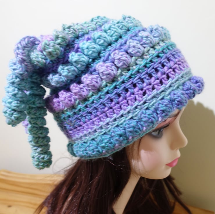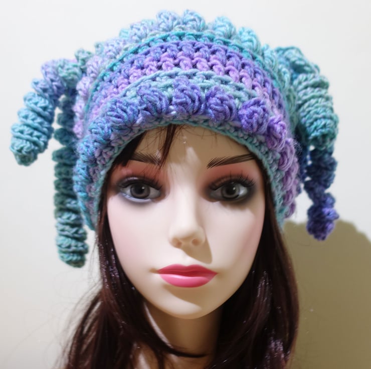 Quirky beanie hat. Hand crochet in vegan friendly acrylic yarn in soft hues of blue and pink. The stitches are textured for added warmth and the curly tassels add movement and interest. These hat are super warm, easy to pull on and stand out in a crowd. The mix of pinks is truly lovely adding depth and texture.