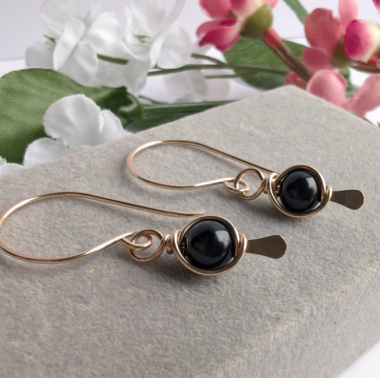 Handmade gold filled dangle earrings featuring tourmaline beads. Black Tourmaline beads wire wrapped onto a 14K gold filled paddle head pin to form a frame around the gemstones. These earrings would make a lovely gift for yourself or a loved one.