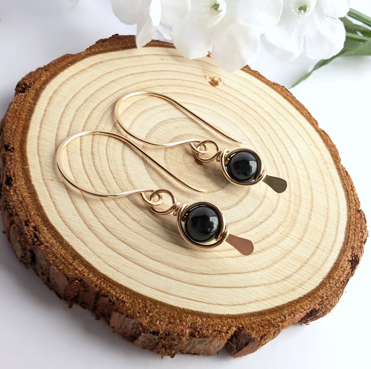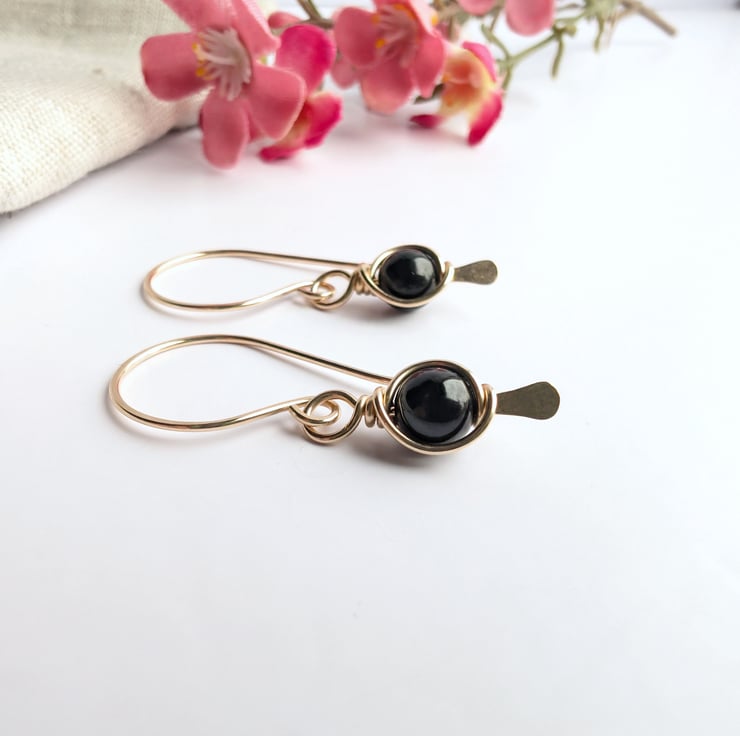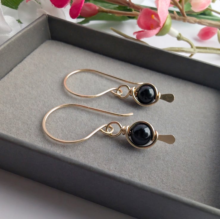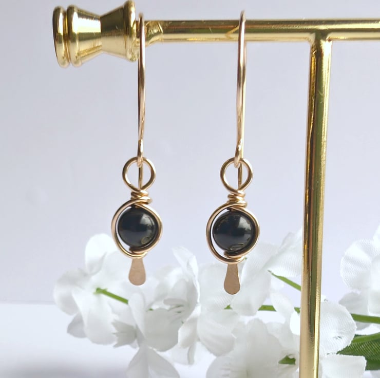 Handmade gold filled dangle earrings featuring tourmaline beads. Black Tourmaline beads wire wrapped onto a 14K gold filled paddle head pin to form a frame around the gemstones. These earrings would make a lovely gift for yourself or a loved one.