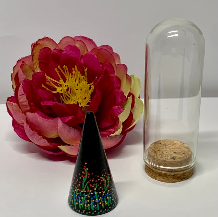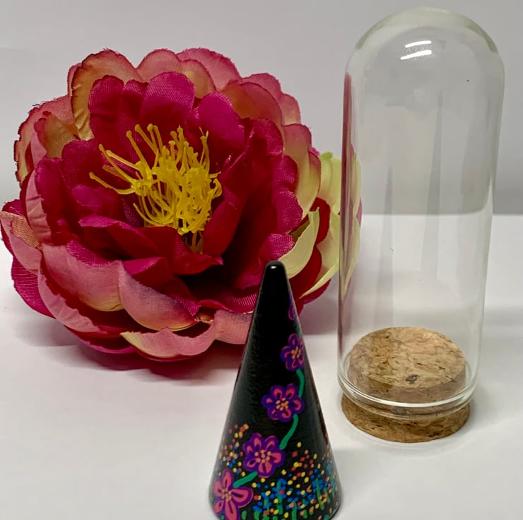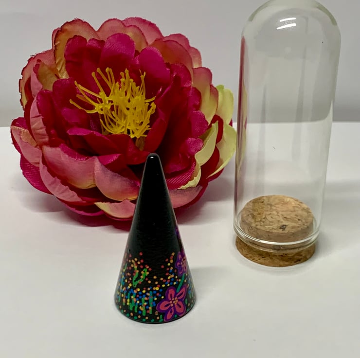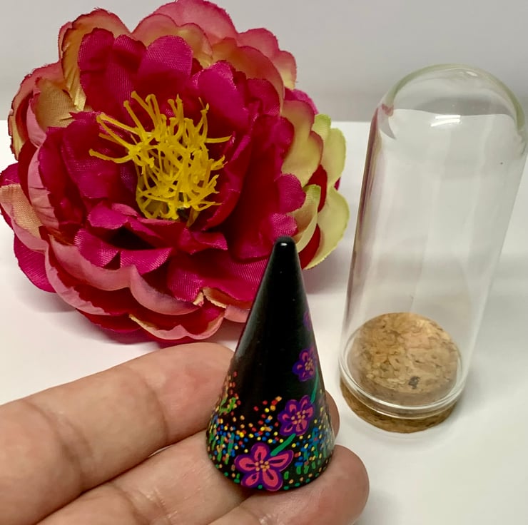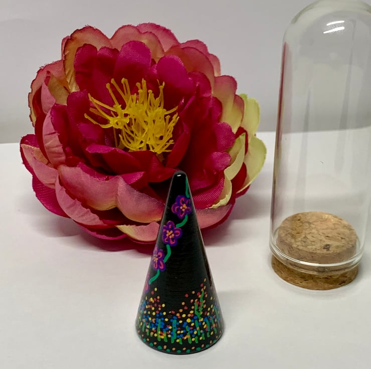 Small wooden Hand painted cone decorated in a pretty floral design on a black background. The flowers wrap around the cone giving a view of the design from all angles. The flowers vary in size and are painted in pink and purple tones with an orange centre. Red, Orange, blue, yellow and green make up the rest of the design. This One of a kind piece comes with a glass display dome giving yourself or a recipient the option of how you choose to display it. This would make a lovely sentimental / memory gift given on occasions such as Birthdays, Anniversaries or as a reminder of a special day.