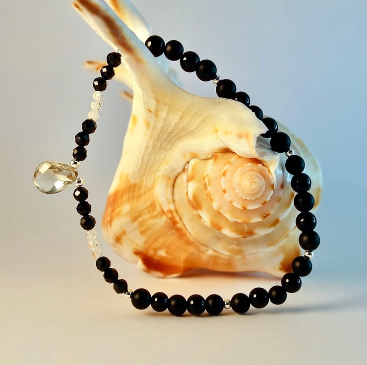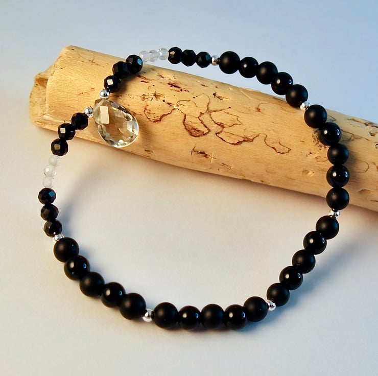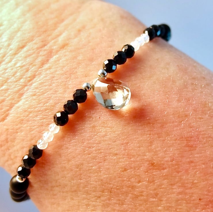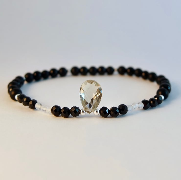 Beautiful, sparkly bracelet featuring a 12x7mm AA faceted Green Amethyst teardrop set between trios of 3mm AAA grade faceted black Spinel separated by a trio of 2mm AA grade faceted White Topaz.