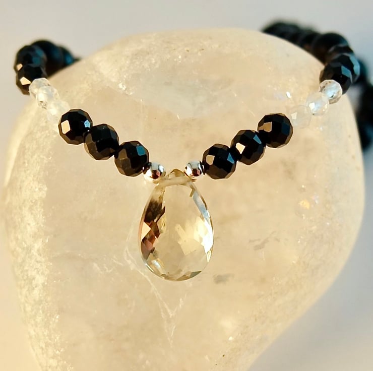 The faceted Spinel and Topaz beads have a lovely sparkle, and the Green Amethyst teardrop has a delicate, pale sage green colour and eye clean clarity.