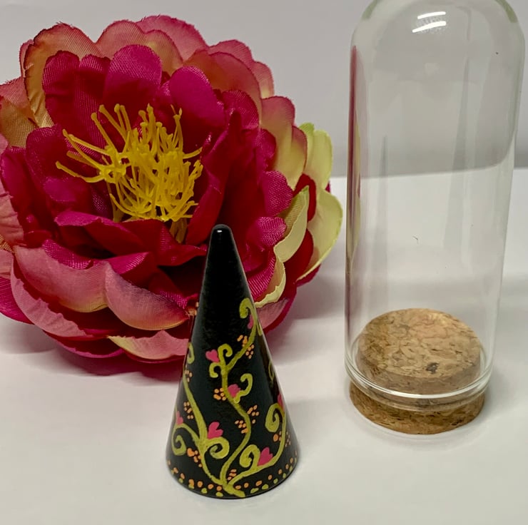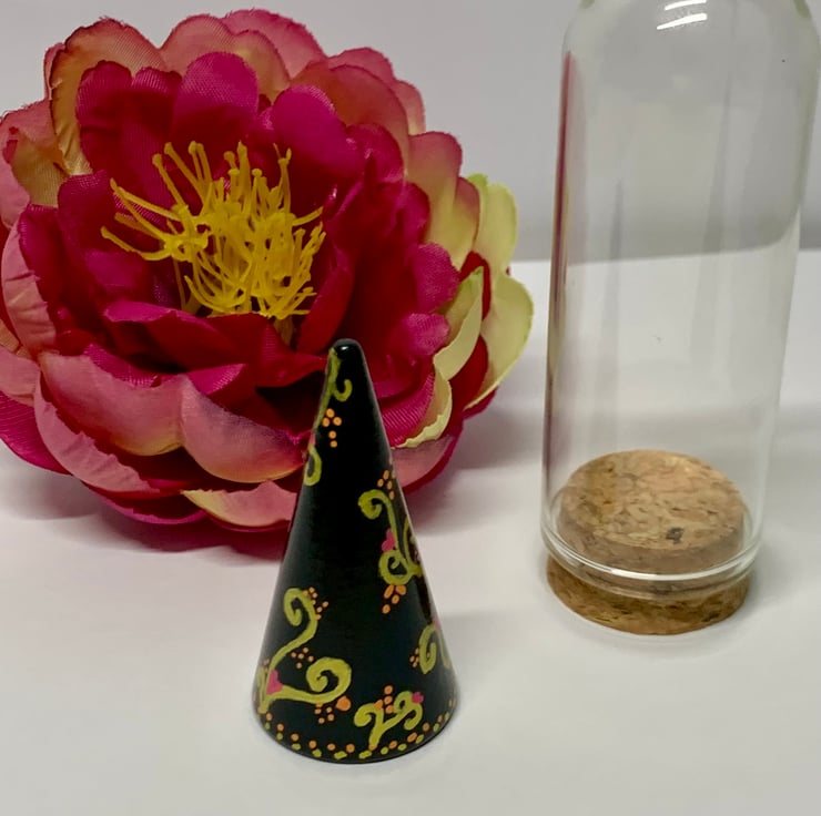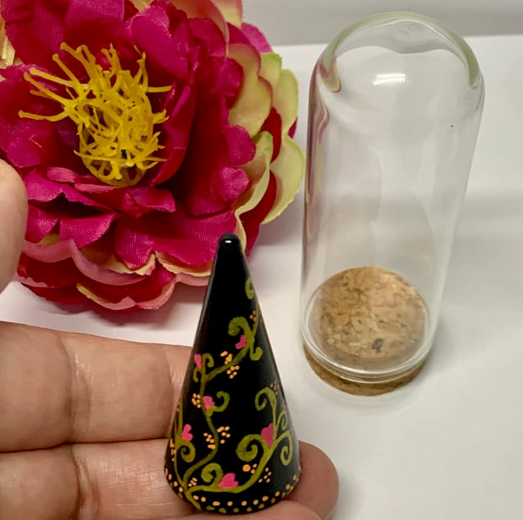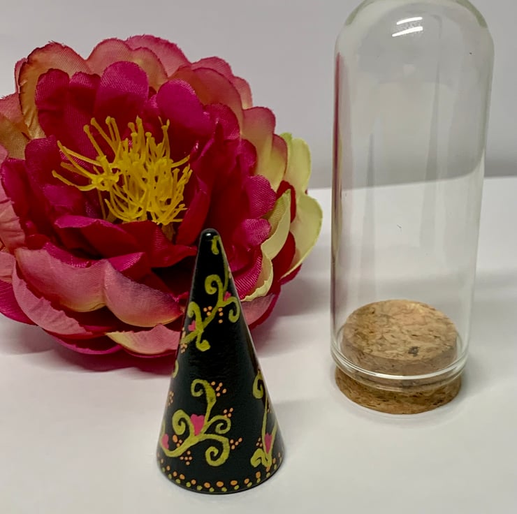 Small wooden Hand painted cone decorated in a swirl and floral design on a black background. The swirls wrap around the cone giving a view of the design from all angles. The pattern is painted in a metallic gold with a pink and orange flower effect. This One of a kind piece comes with a glass display dome giving yourself or a recipient the option of how you choose to display it. This would make a lovely sentimental / memory gift given on occasions such as Birthdays, Anniversaries or as a reminder of a special day.