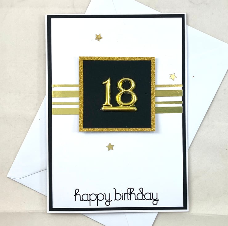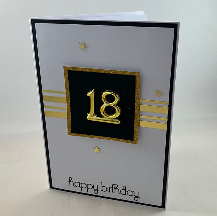 A6 sized 18th birthday card. The card features a handmade topper created from a gold coloured '18' cake decoration overlaid onto black card and then gold glitter card. The sentiment 'happy birthday' has been printed onto white card, mounted onto black card, with strips of gold foil running across and gold stars attached.