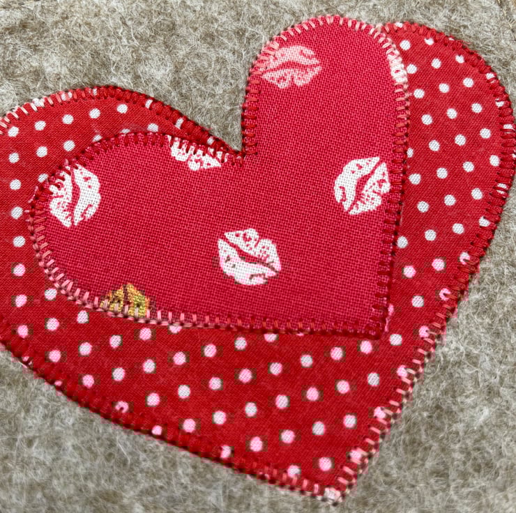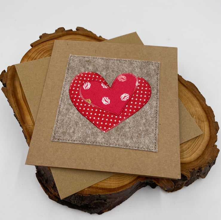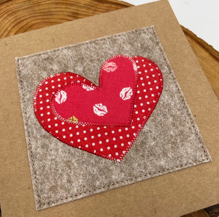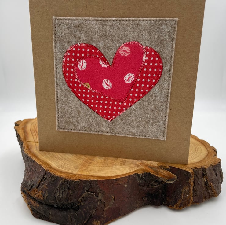 Share the love with this delightful handmade card! Featuring two appliqué hearts—one in red with playful white dots and the other adorned with a charming red lips design—it’s perfect for Valentine’s Day, anniversaries, or any romantic occasion. Carefully crafted on eco-friendly recycled card, it’s blank inside for your heartfelt message. A sweet and unique keepsake that’s sure to make them smile!