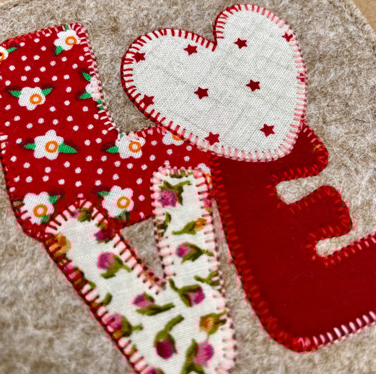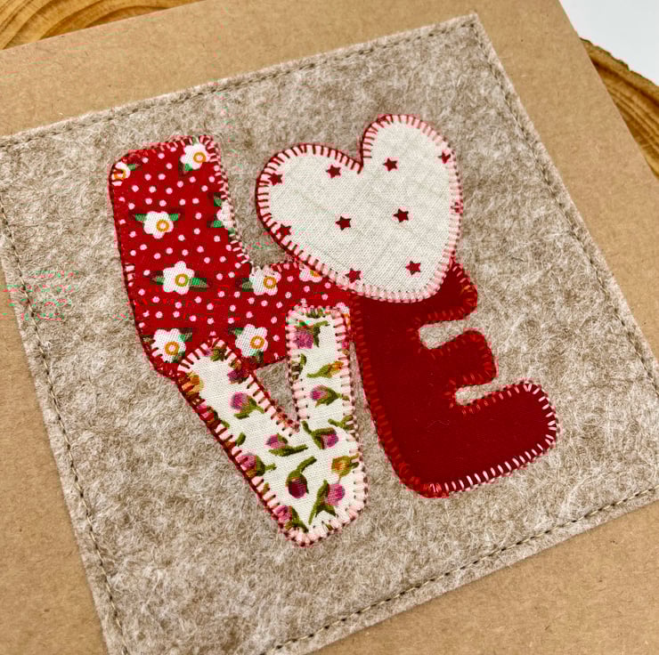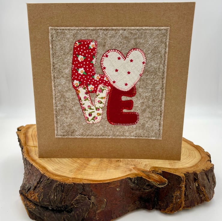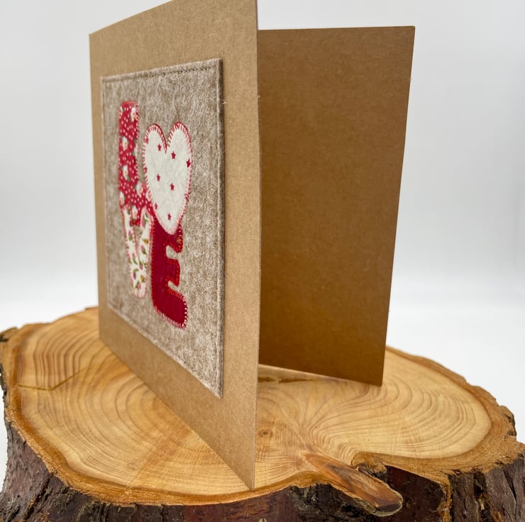 Celebrate love in all its patchwork glory with this charming handmade card! The word 'LOVE' is beautifully stitched in a mix of vibrant fabrics onto soft woollen felt, creating a unique and cozy design. Mounted on eco-friendly recycled card and blank inside, it’s perfect for Valentine’s Day, anniversaries, or any heartfelt occasion. A keepsake-worthy card, thoughtfully crafted to spread joy and warmth.