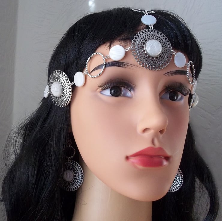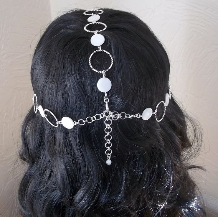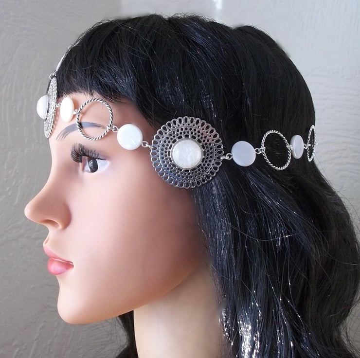 Medieval styled headpiece suitable for wedding, Ren fair or LARP event. Mother of Pearl coin beads & silver tone barley twist soldered rings have been teamed with three stunning pierced round adornments each set with a glass cabochon that looks like captured snow!