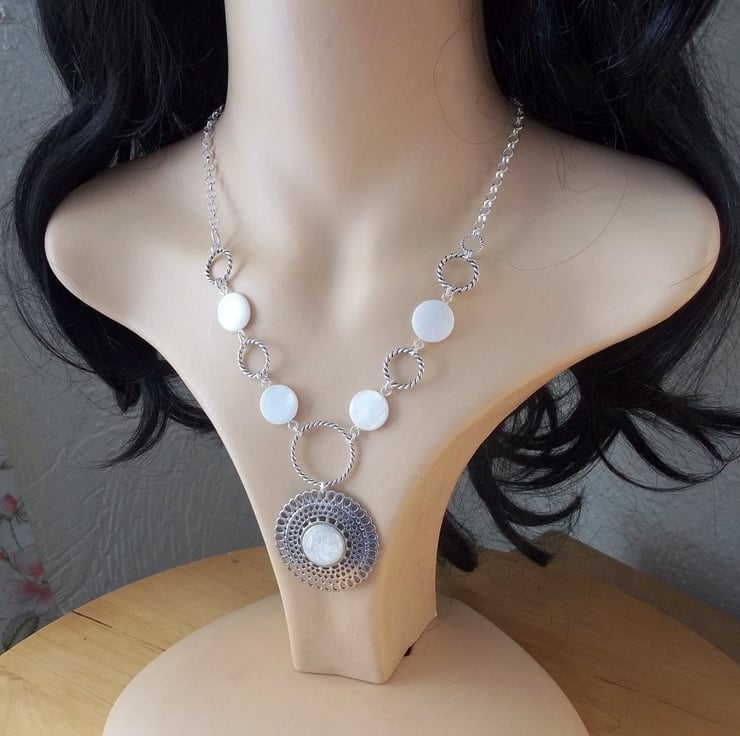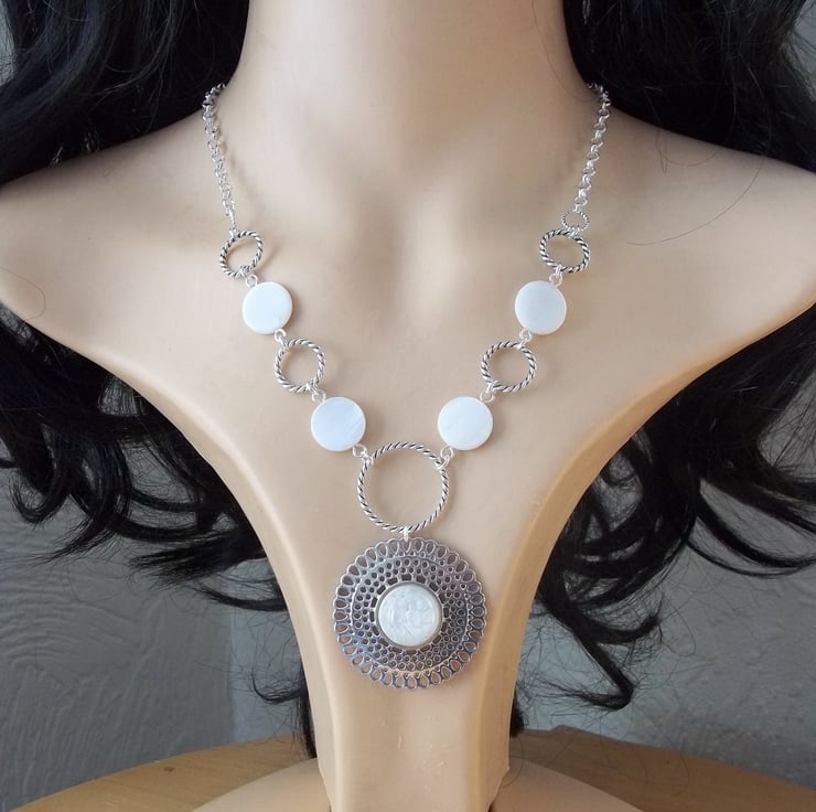 Made with Mother of Pearl, glass cabochons, Tibetan silver/zinc alloy, silver plated chain.