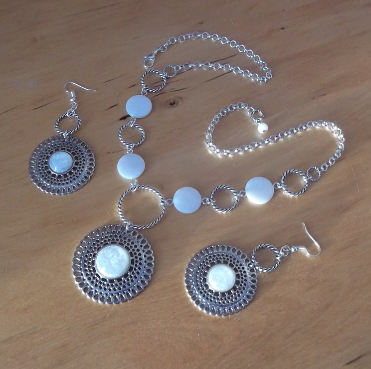 The necklace has a single pierced round adornment suspended as a pendant & is finished with a silver plated round link belcher chain. The earrings are made with two slightly smaller pierced rounds & are finished with silver plated ear wires for pierced ears.