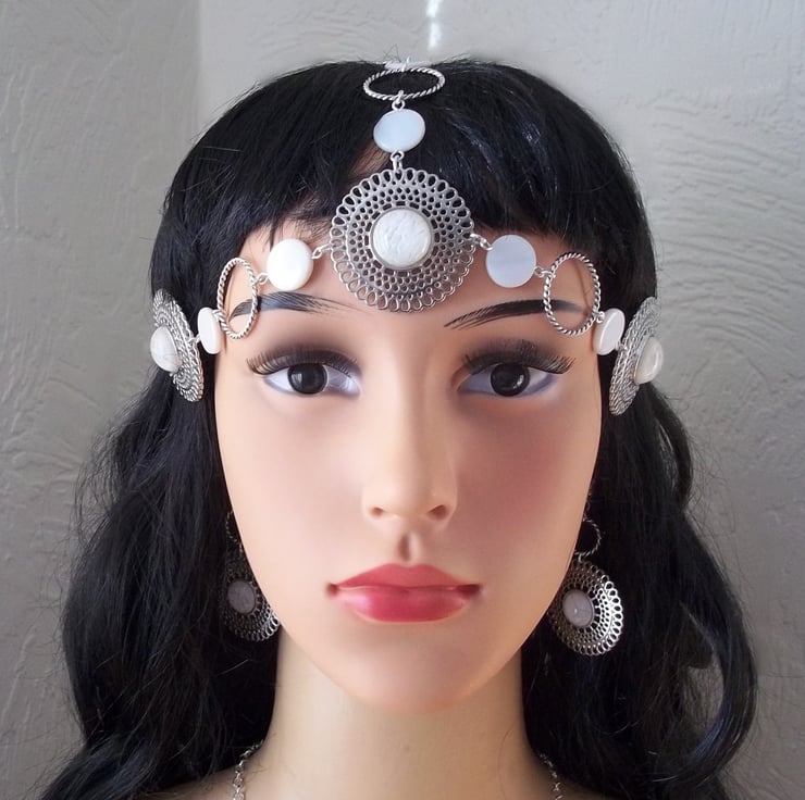 Medieval styled headpiece suitable for wedding, Ren fair or LARP event. Mother of Pearl coin beads & silver tone barley twist soldered rings have been teamed with three stunning pierced round adornments each set with a glass cabochon that looks like captured snow!