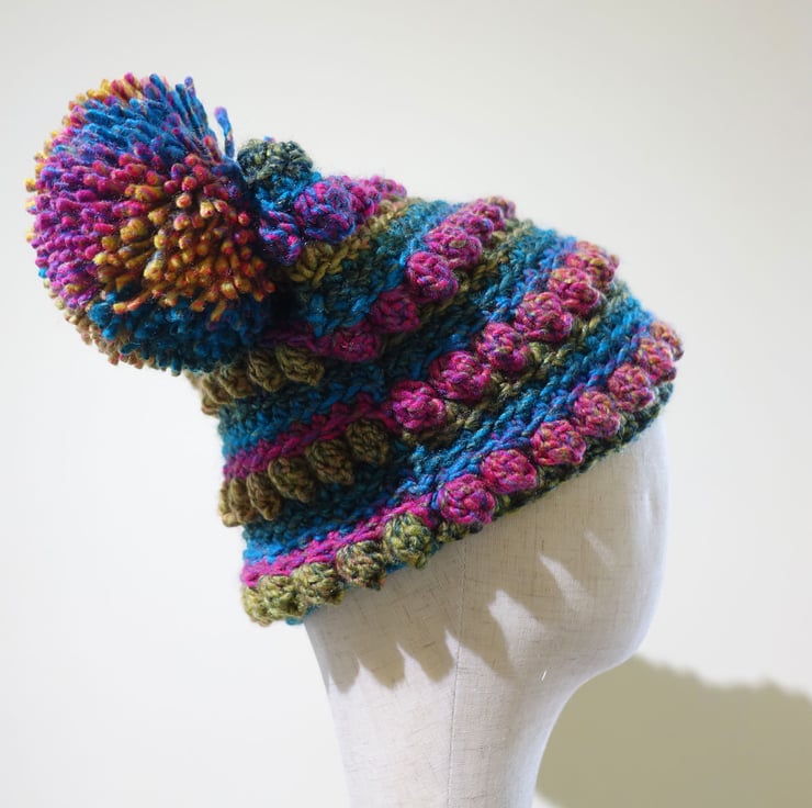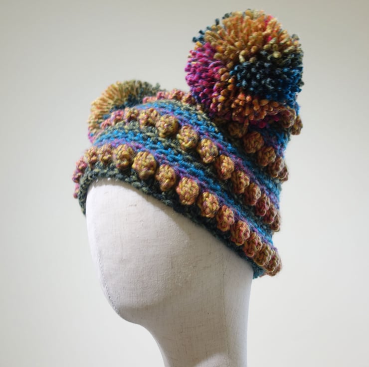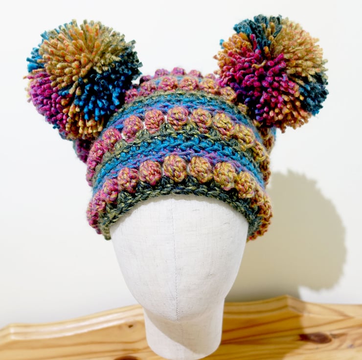 Double pom pom hand crochet beanie in soft earth rainbow colours. This is a chunky yarn that is super soft and washable to 30 degrees. It fits snug over the ears and the cute bear ear pom poms are real show stoppers! Great for teenagers and festival goers. Or just if you want to cut a dash and stand out in the crowd. Super cute and comfy to wear.