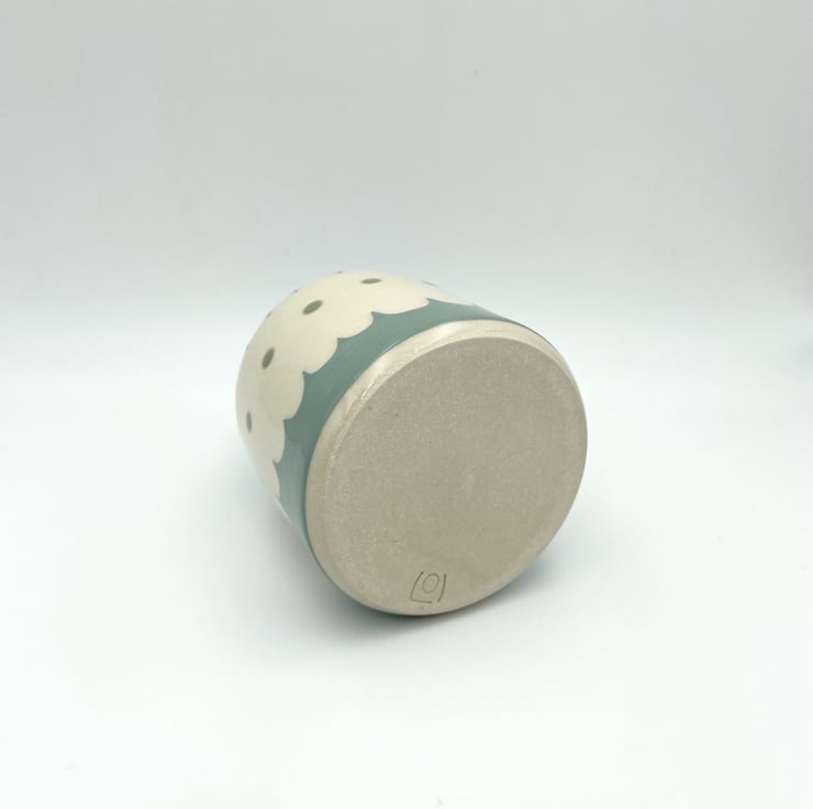This is a soft turquoise vase with green spots. Thrown on the wheel, I then decorate with a coloured slip over stencil shapes that I cut from paper, before peeling them off to reveal the design and adding the coloured spots. I finish with in a clear glossy glaze, making a durable keepsake.