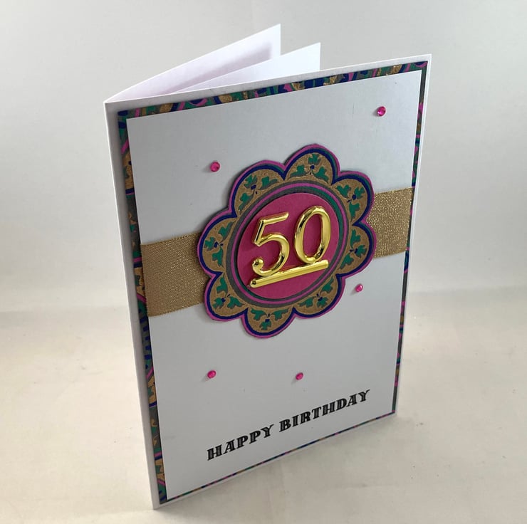 A6 sized 50th birthday card. The sentiment 'Happy Birthday' has been printed onto white card and mounted onto multi coloured handmade paper. A section of the same paper has been cut out to provide a frame for the topper, featuring a gold coloured '50' on bright pink card. This has been laid over a length of gold organza ribbon and the card is finished with small pink gems.