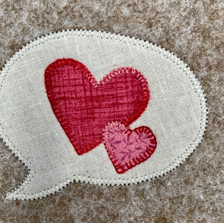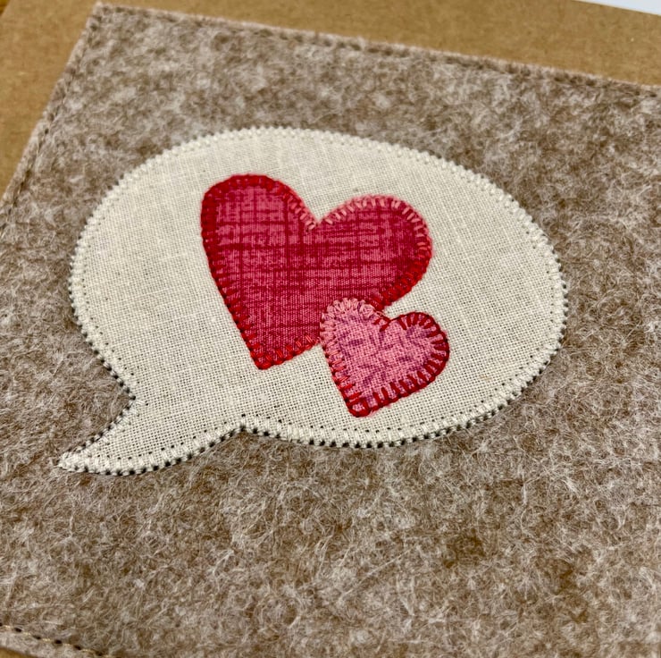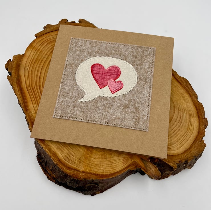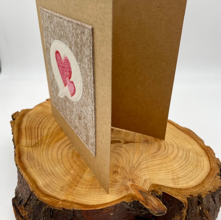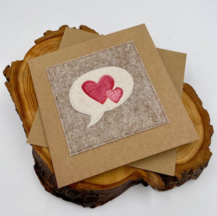 Let your love speak volumes with this charming handmade card! Featuring a whimsical appliqué speech bubble paired with two connected hearts, this design is perfect for Valentine’s Day, anniversaries, or any romantic occasion. Lovingly stitched onto wooden felt on eco-friendly recycled card, it’s blank inside for your personal message. A unique keepsake that’s as thoughtful as it is delightful
