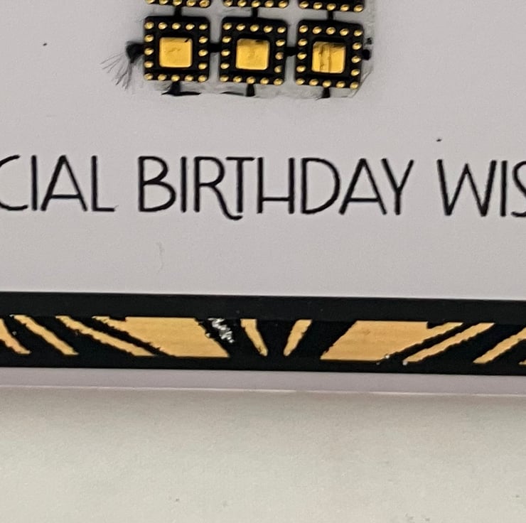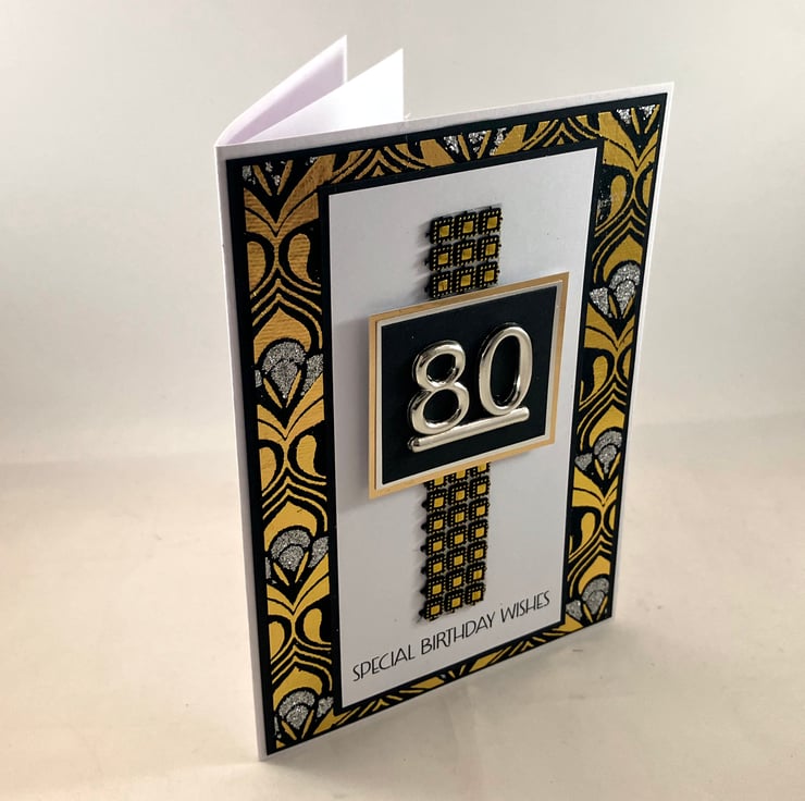 A6 sized 80th birthday card. The card features a handmade topper created from a silver coloured '80' cake decoration overlaid onto black card and then silver and gold mirri card. The sentiment 'Special birthday wishes' has been printed onto a length of white card, mounted onto black card over gold, black and silver art deco style handmade paper. The topper is laid over a triple strip of black and gold adhesive embellishments.