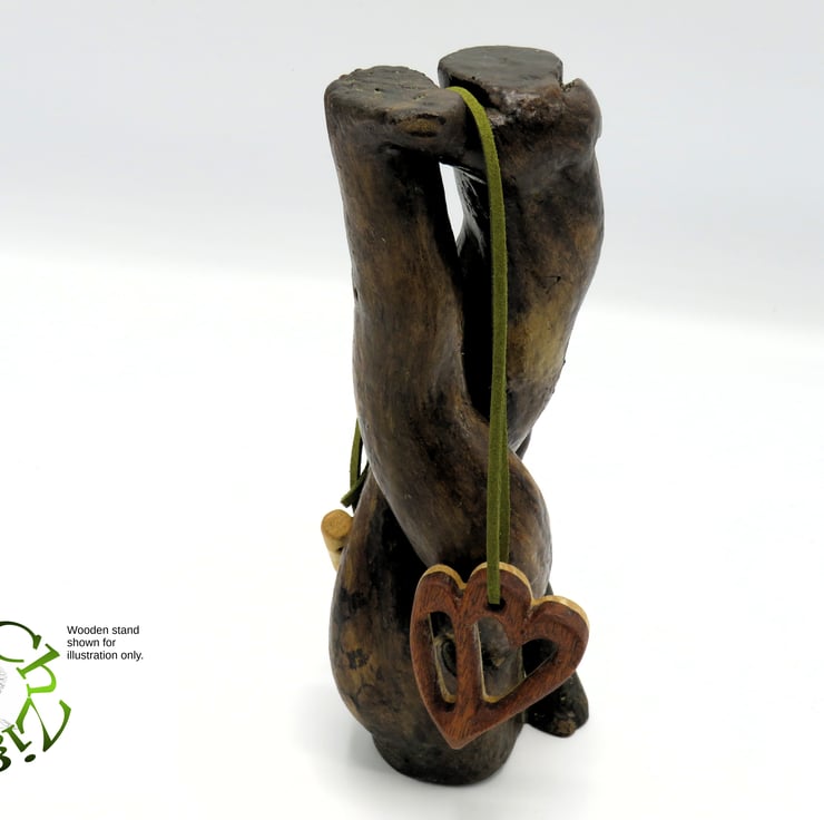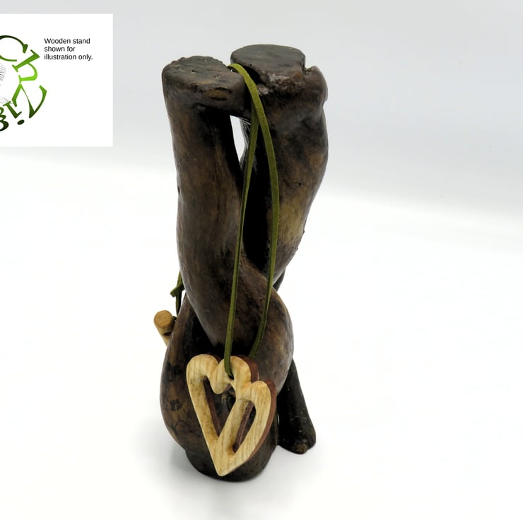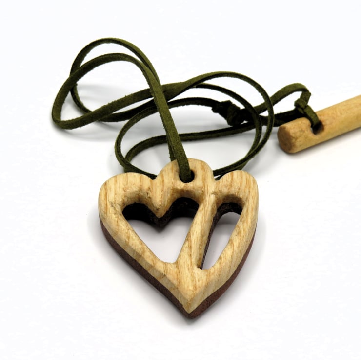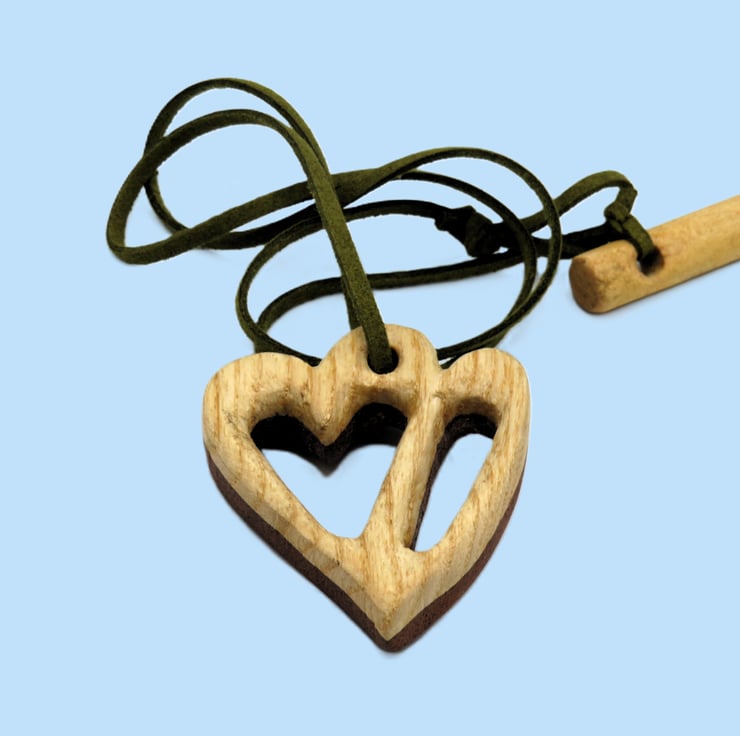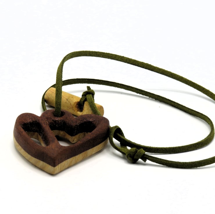 This is a wood two heart necklace made from English ash and recycled Mahogany woods with an olive green vegan friendly suede necklace and recycled hardwood toggle fastener. The necklace uses a wood toggle and a loop in the suede necklace, similar to a duffle coat. The heart was designed by us and handcrafted from recycled wood. It was cut by hand using a fret saw and a drill to produce the pierced inner heart shaped then shaped with a chisel and sandpaper. Initially the timbers were glued together with epoxy resin and the woods are laid as laminates, for the stability of the wood and the look of the pendant