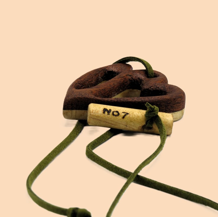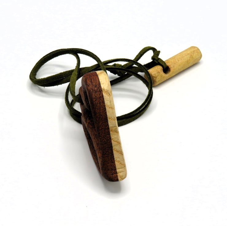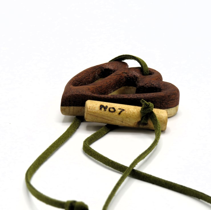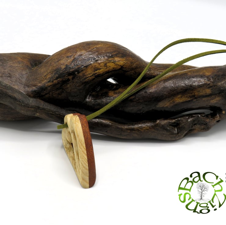 This necklace can be worn in one of two ways with the creamy white English ash wood side showing or the red brown recycled Mahogany showing depending on your mood.