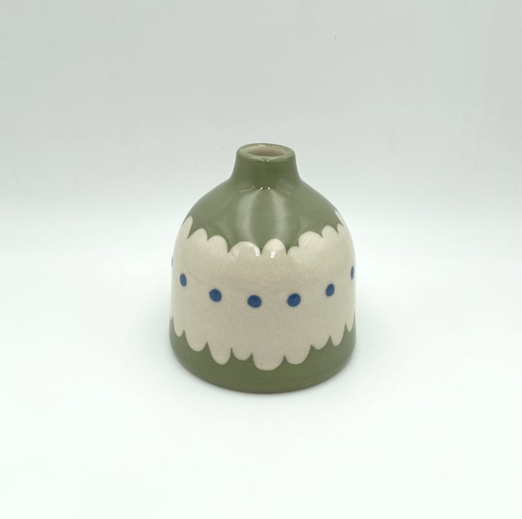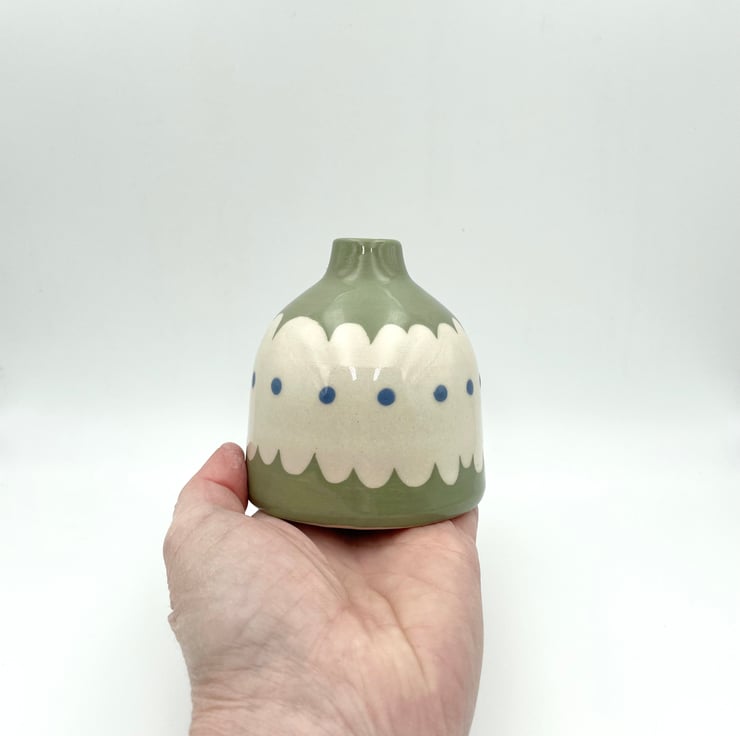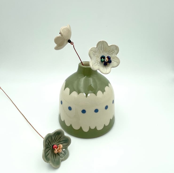 This soft green vase has blue spots. With a narrow neck, these little vases are ideal for a few thin stems. Also perfect for my ceramic flowers (see separate listings for these).