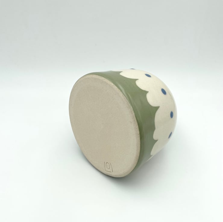 Thrown on the wheel, I then decorate with a coloured slip over stencil shapes that I cut from paper, before peeling them off to reveal the design and adding the coloured spots. I finish with in a clear glossy glaze, making a durable keepsake.