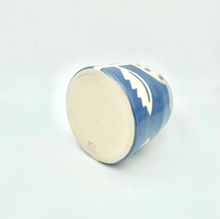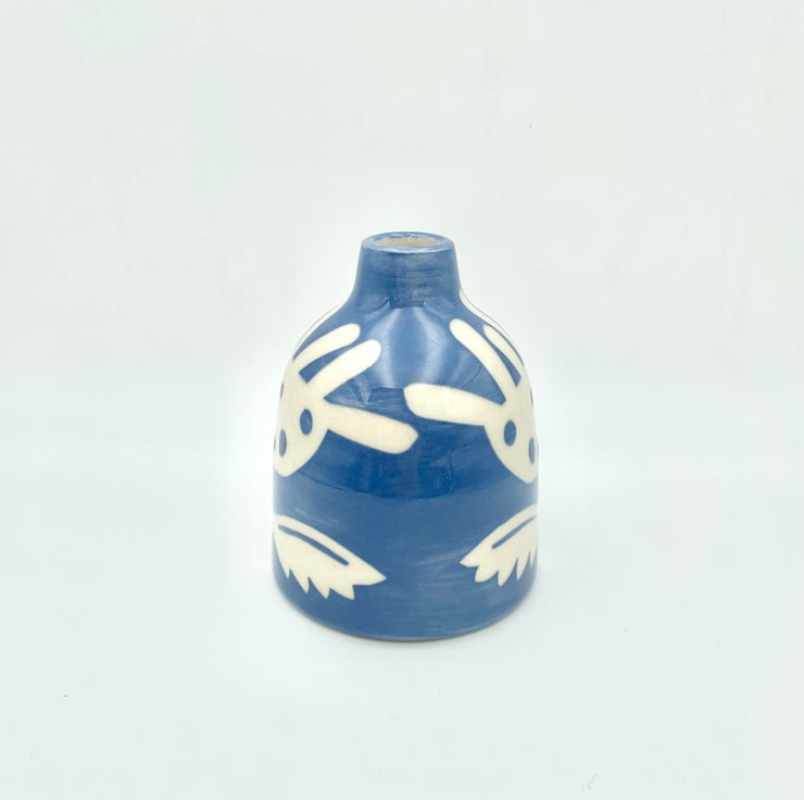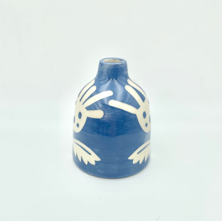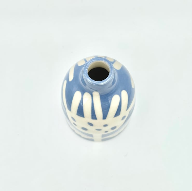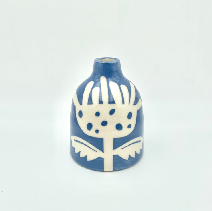 I first threw this stoneware vase on the wheel, then decorated it with a pretty soft cornflower blue slip over flower stencil shapes that I cut from paper, before peeling them off to reveal the design. I finished the vase in a clear glossy glaze, making it a durable keepsake.
