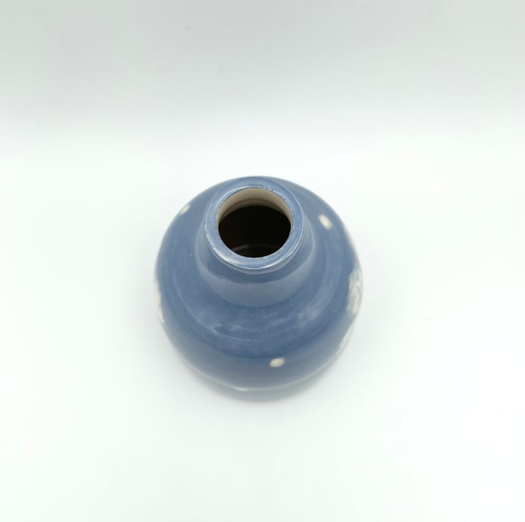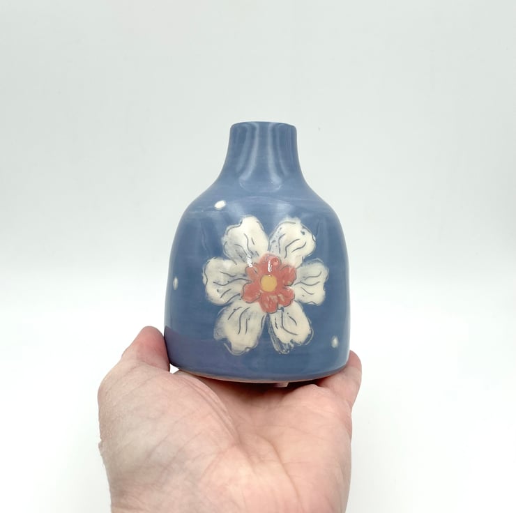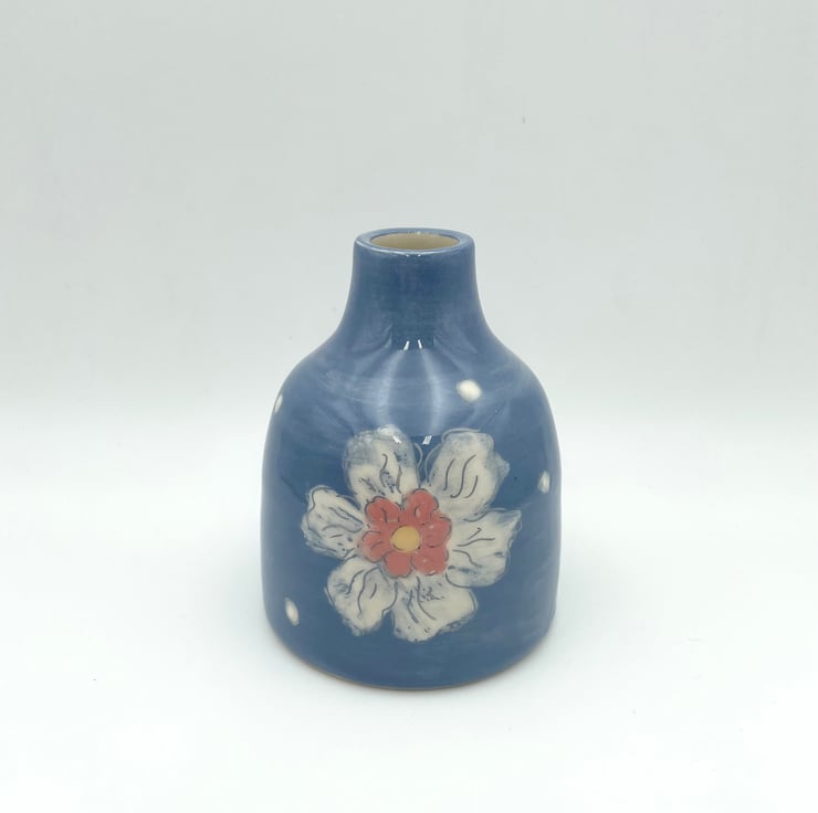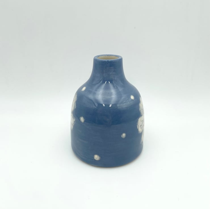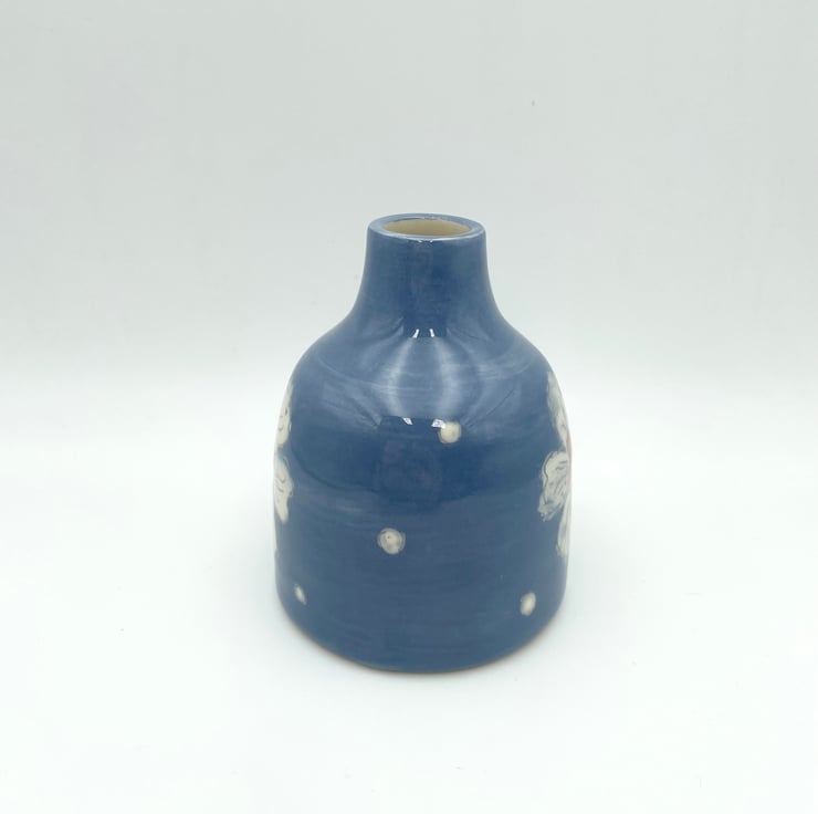 Thrown on the wheel, I then decorated the vase with blue slip and monoprinted white & pink flowers before using a needle to define the flower shapes with thin lines before filling them with underglaze. A time-consuming but enjoyable process. I finish with in a clear glossy glaze, making a durable keepsake.