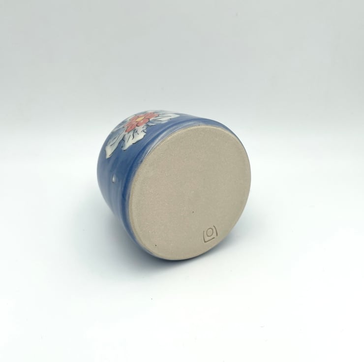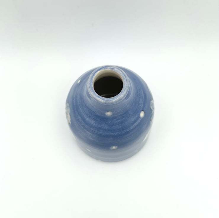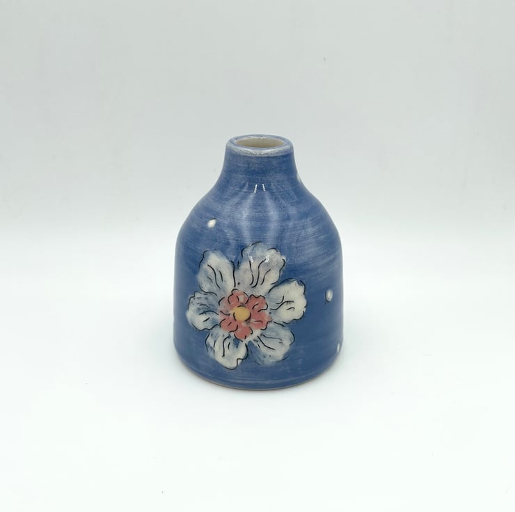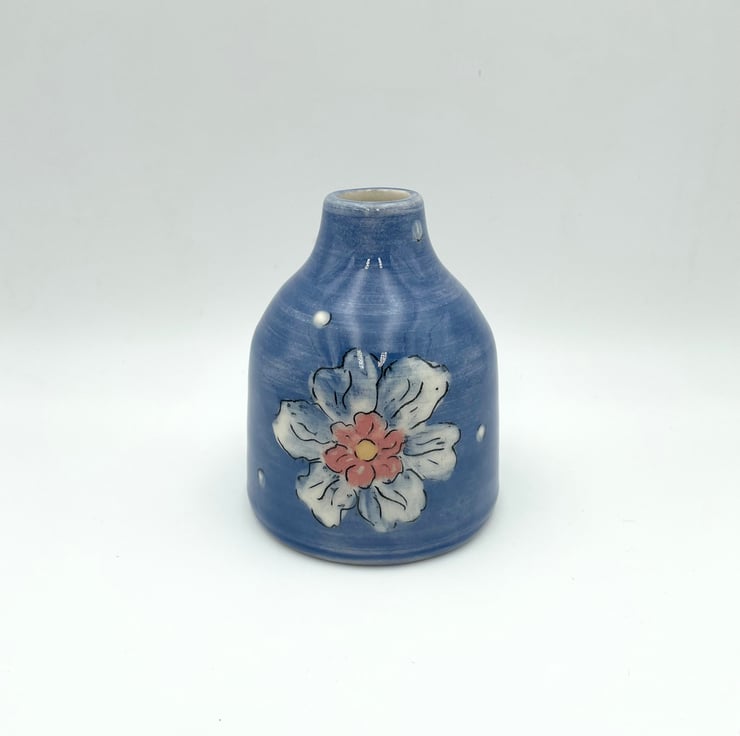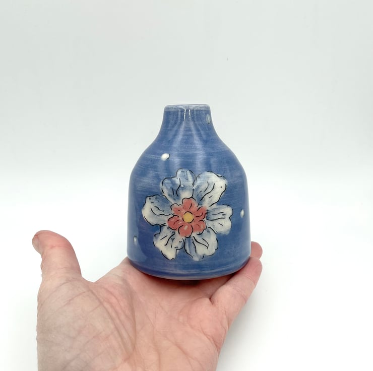 Thrown on the wheel, I then decorated the vase with washy blue slip and monoprinted white & pink flowers before using a needle to define the flower shapes with thin lines before filling them with underglaze. A time-consuming but enjoyable process. I finish with in a clear glossy glaze, making a durable keepsake.