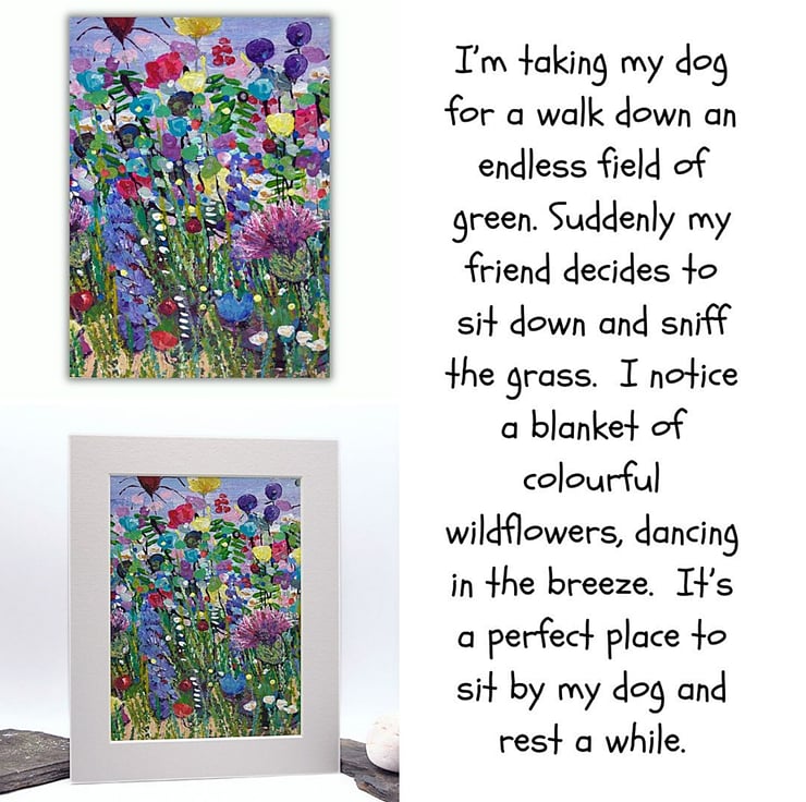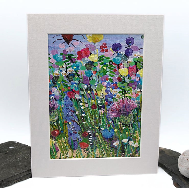 This is an original painting featuring colourful wildflowers. It is a beautiful, sunny day and the wildflowers stretch high to the sky. I’ve used thick layers of paint to bring a highly textured quality to the work. I've applied the acrylics using a mix of brushes, painting knives and sponges.