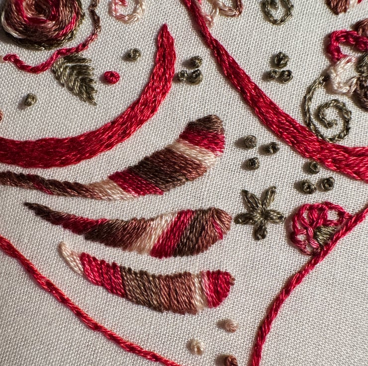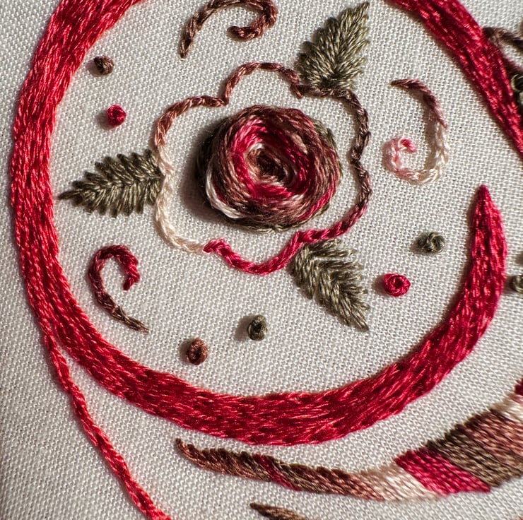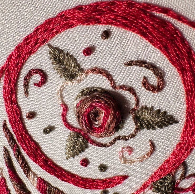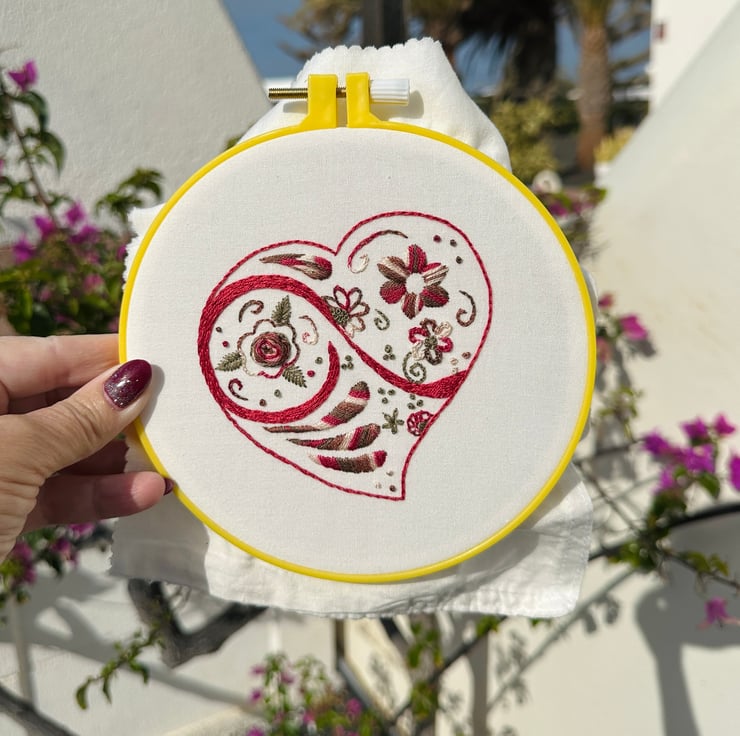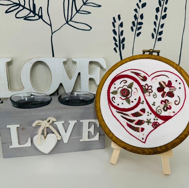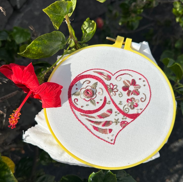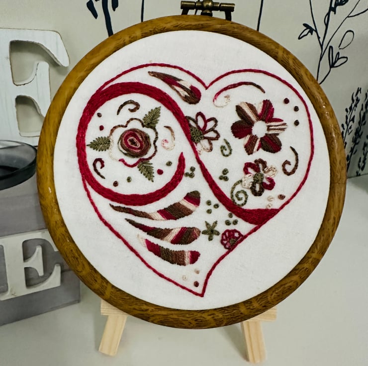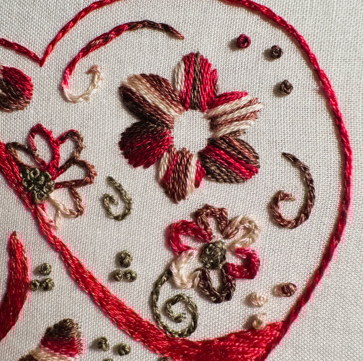 A host of different textured stitches and shades of ruby red, pinks, cream and soft green fill the heart with florals and foliage and swirls of colour.