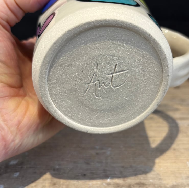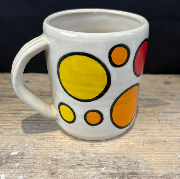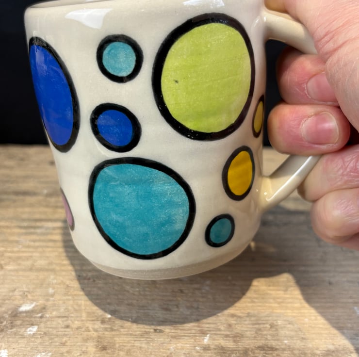 Lovingly handmade thrown stoneware mugs made from white stoneware clay. After the first firing it has been underglazed (hand painted) with colourful spots outlined in black. These were then dipped in a glossy transparent glaze and fired for a second time.
