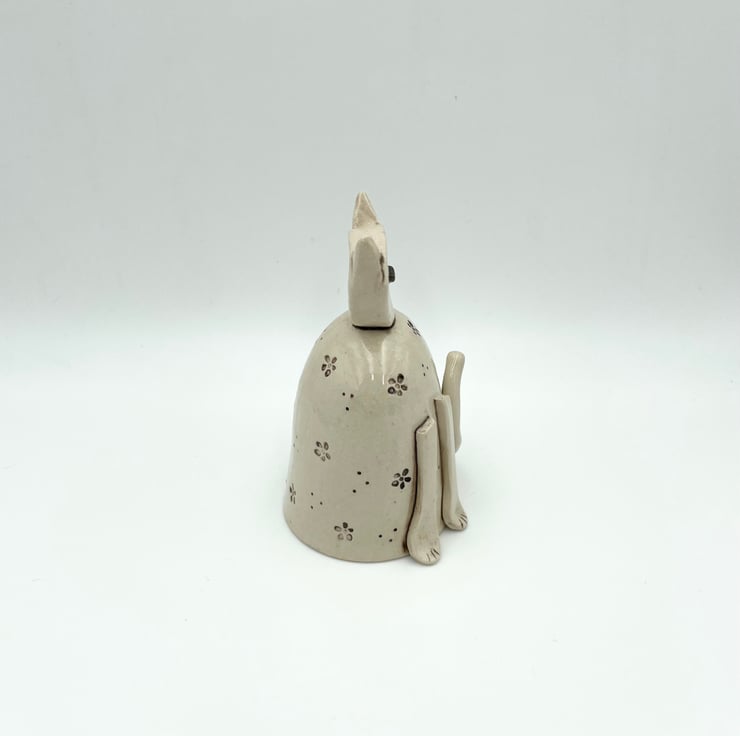 I’ve handmade Flora the kitty cat from stoneware clay and finished her with a glossy clear glaze. I’ve carved and stamped the decoration into the clay surface before firing, then infilled with an underglaze wash to bring out the texture. I hope the joy I have in making comes across in the finished kitty.